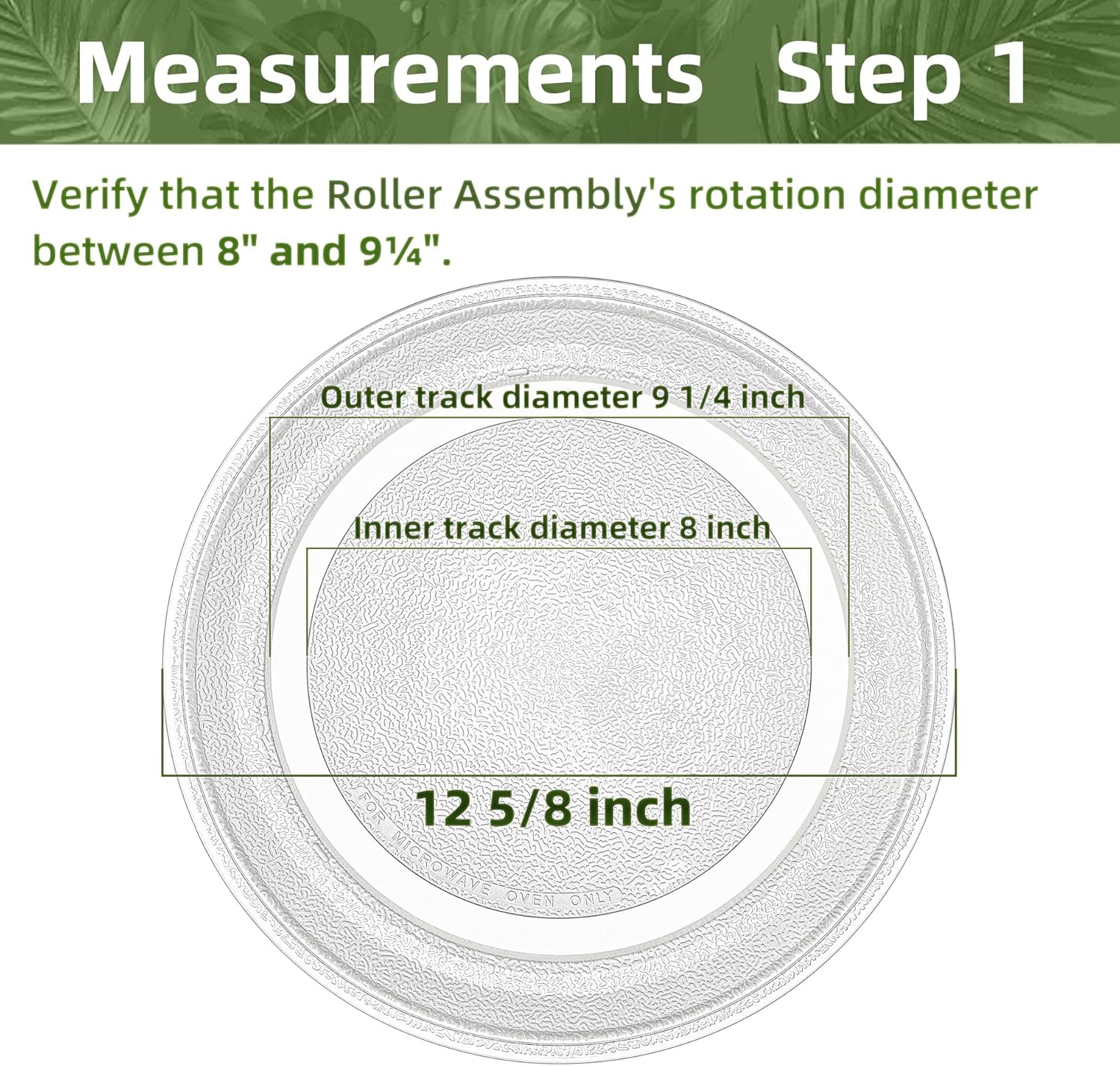 - LOOK OUT! This 12 5/8 inch Microwave plate works with a turntable support that outside diameter measured 9 1/4 Inches. Plates with different track diameters are NOT compatible. You can either search for your microwave model number in the model chart of this page's Product Description, or have us verify it for you
