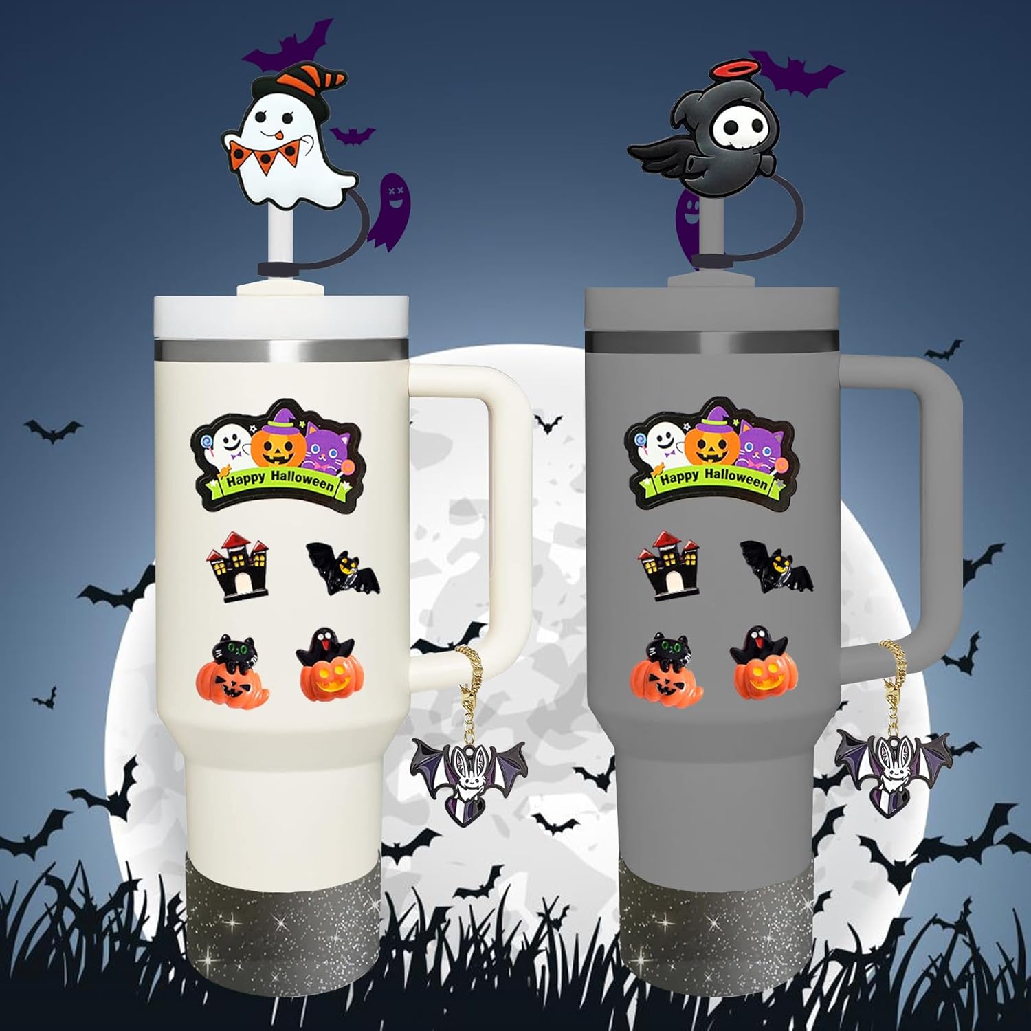 - Complete Package: 3pcs Straw Cover, 4pcs Halloween 3D Stickers & 1pcs Flat Stickers, and 1pcs Halloween bat Handle Charm, 1pcs Silicone Boot for Stanley Cup. Suitable for Stanley Quencher 30/40 oz and Stanley IceFlow 20/30 oz tumblers water bottles & others cup bottom diameter 2.75-2.95 inch