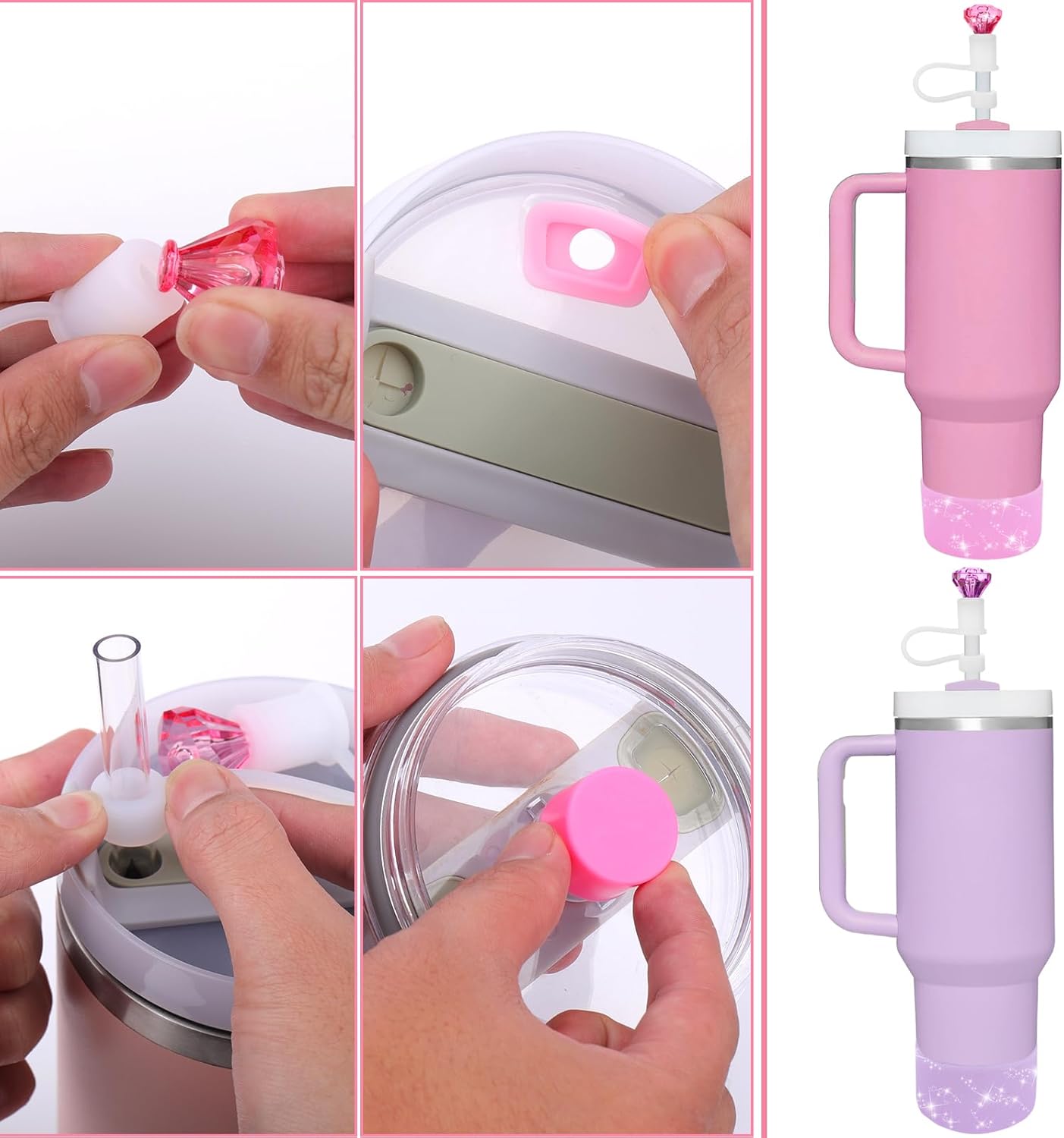 - [PERFECT LOOK AND DESIGN]:Our set adopts the same color scheme, made of pink and white sets, and the diamond straw cap and shiny bottom protector echo each other, shining, very eye-catching and easy to identify and differentiate your cups, unique shapes and colors make your cups no longer monotonous, unique and dazzling, very suitable for your unique temperament