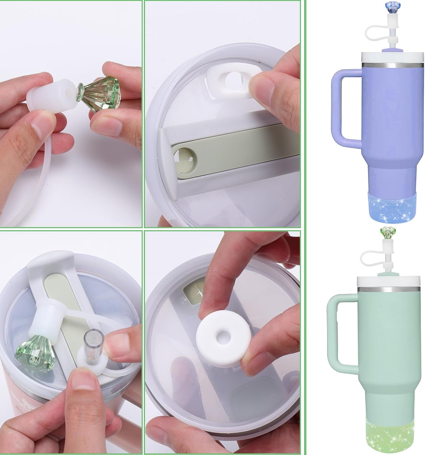 - [COMPLETE MUG SET]:The accessory set is very well matched for stanley mugs. The silicone leak-proof stopper features a 360° leak-proof design, the diamond straw lid is compatible with 9-11mm diameter straws, and the bottom protector protects the cup from impacts, scratches, slips, and prolongs the life of the cup. This set can meet your needs of protecting and dressing up your cups
