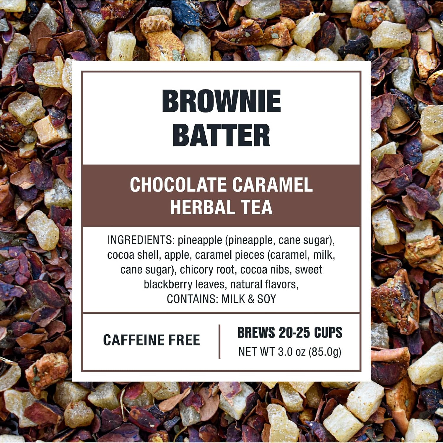 • PREMIUM LOOSE LEAF INGREDIENTS: Our Brownie Batter Tea blends natural ingredients like sweet pineapple, rich cocoa shells, apple, caramel pieces, chicory root, cocoa nibs, and sweet blackberry leaves. This carefully crafted mix delivers a decadent, chocolatey flavor with a subtle sweetness. Enjoy a rich, indulgent tea experience with every cup. Please note: this product contains milk and soy.