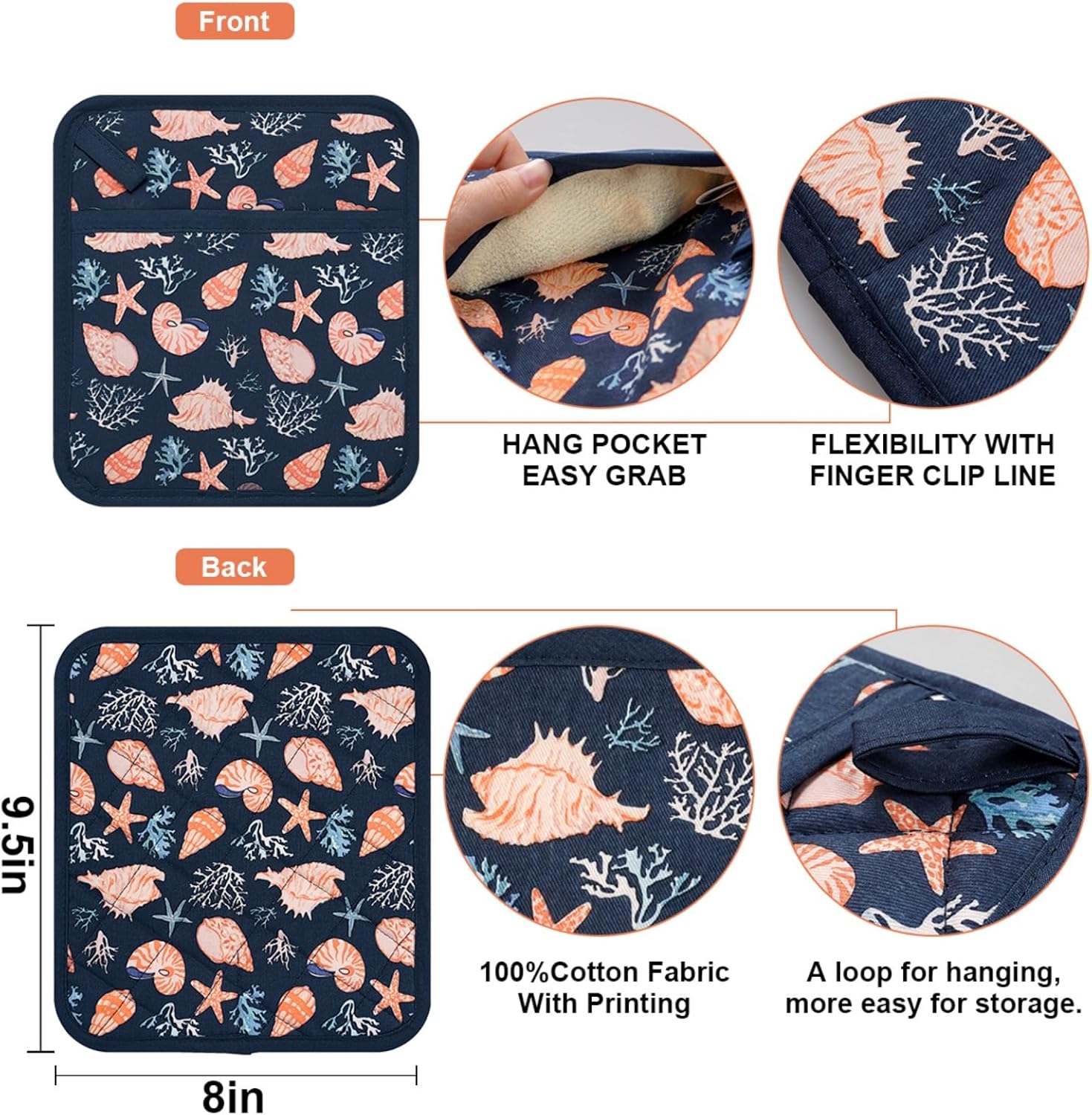 Pot Holders Set of 2 Heat Resistant 480℉ Kitchen 100% Cotton Comfortable Lining Printing Cowry Flower Women Men Home Cooking Baking Microwave BBQ Gift (Cowry potholders)