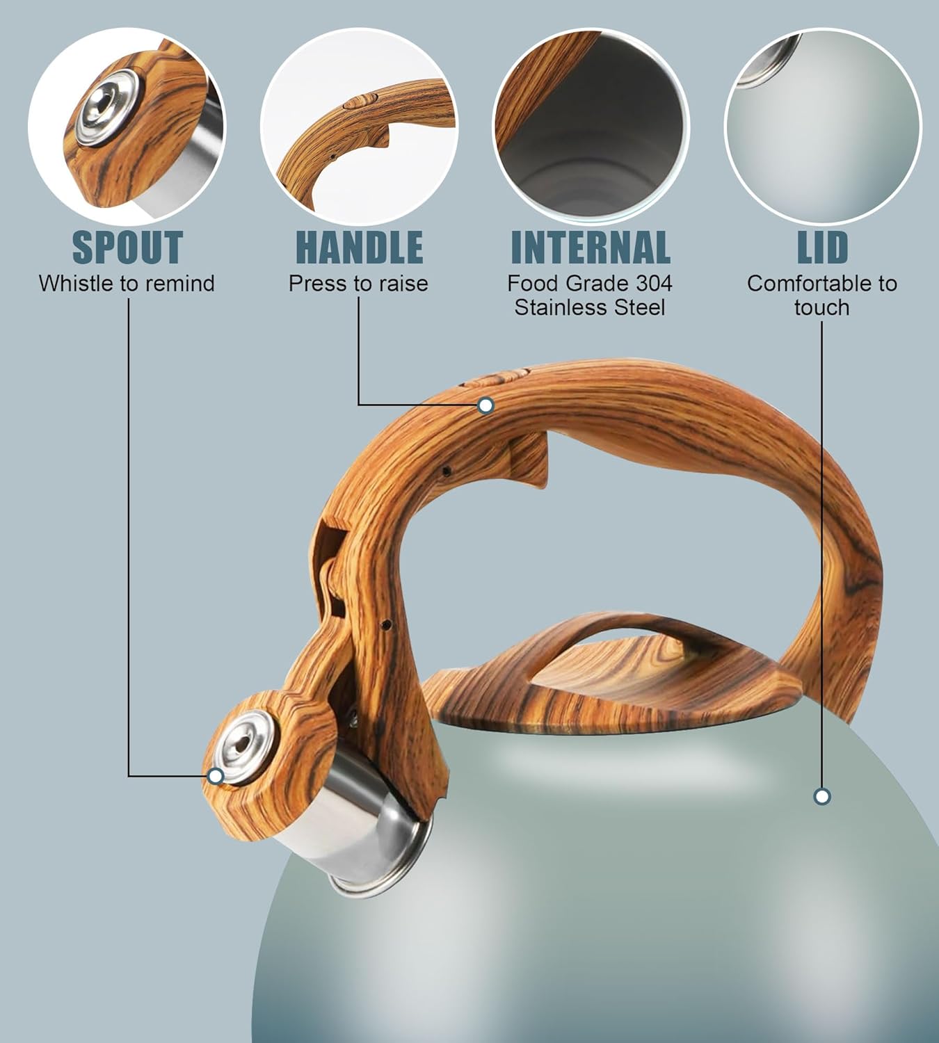 - [Loud Whistling Sound] Whistling Tea Kettle for Stove Top .The whistle of the tea boiling kettle will alert you when the water is boiling, even if you are busy doing chores, watching TV, listening to music or other things. The loud whistle allows that you can hear it from another room when the water is boiled. Effectively reduce Safe hazards and prevent