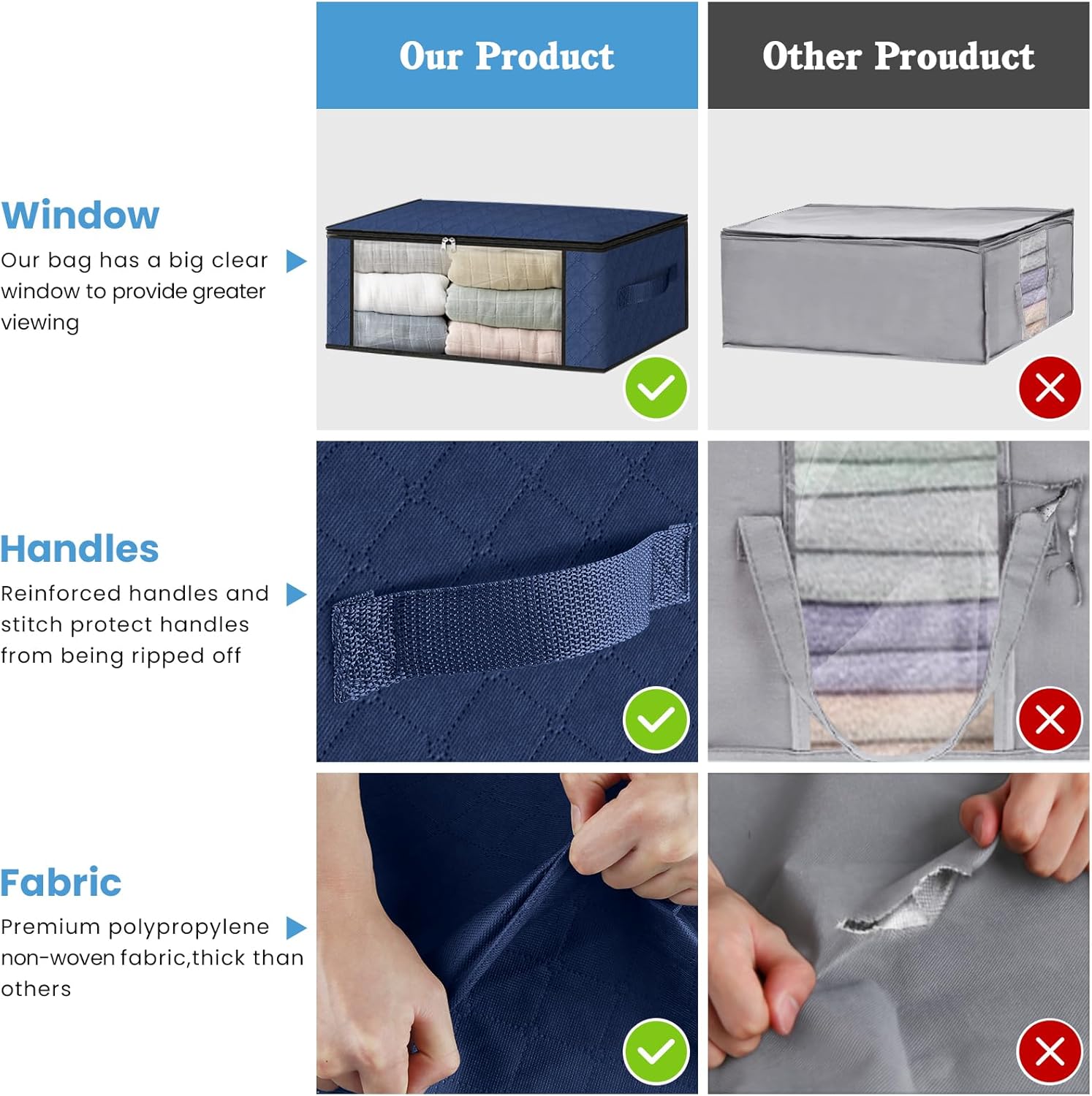 - Reinforced Handles: The reinforced handles are sewn with 3 layers of fabric to ensure easier carrying. You can lift the storage box without worrying about it breaking when filled with heavy clothes