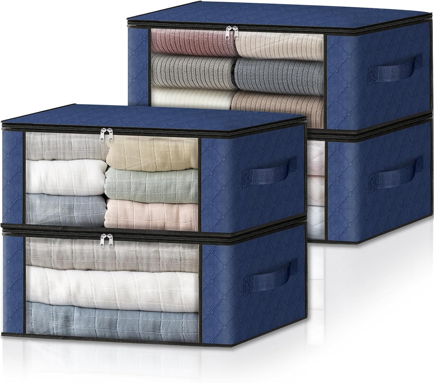 HomeHacks Storage 4-Pack Clothes Organizer Storage Bags Foldable Storage Box with Large Clear Window Sturdy Handles for Closet, Dorm, Pillows, Bedding, Clothes, Blankets, 35L, Blue