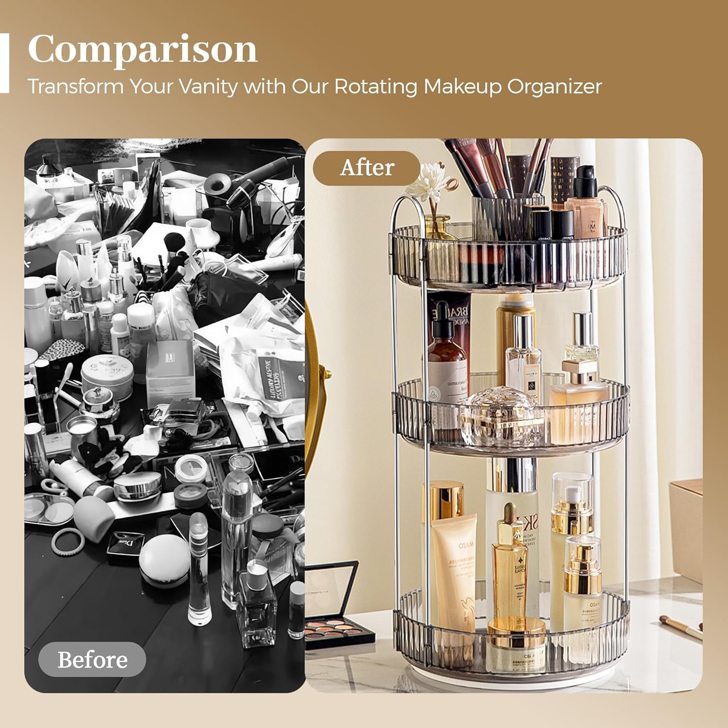- 360° Smooth Rotation: This 360° rotating Lazy Susan organizer offers ample storage for skincare, cosmetics, perfume, makeup, and toiletries. Its space-saving design optimizes up to 80% of available space. Customize the number of layers to fit your needs, making it perfect for your bathroom or countertop.