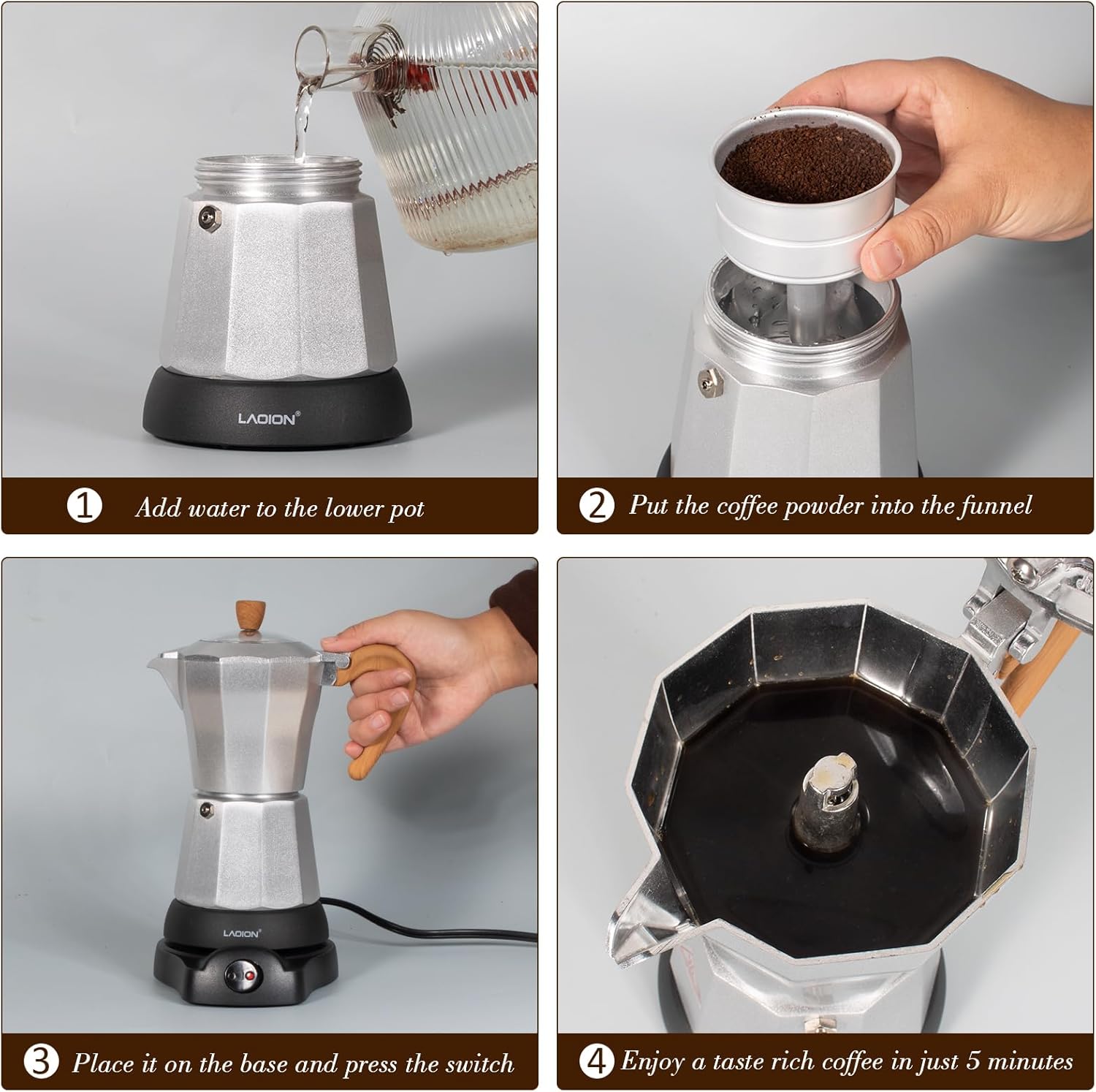 • 【One-Touch Operation: Quick and Convenient】Say goodbye to complicated setups and stovetop brewing. Simply add water and coffee grounds, press the switch, and wait just 5 minutes. This electric mocha pot will deliver a rich Italian espresso with ease. Using advanced high-pressure extraction technology, it fully captures the essence of the coffee beans, offering a flavorful and indulgent experience with every sip.