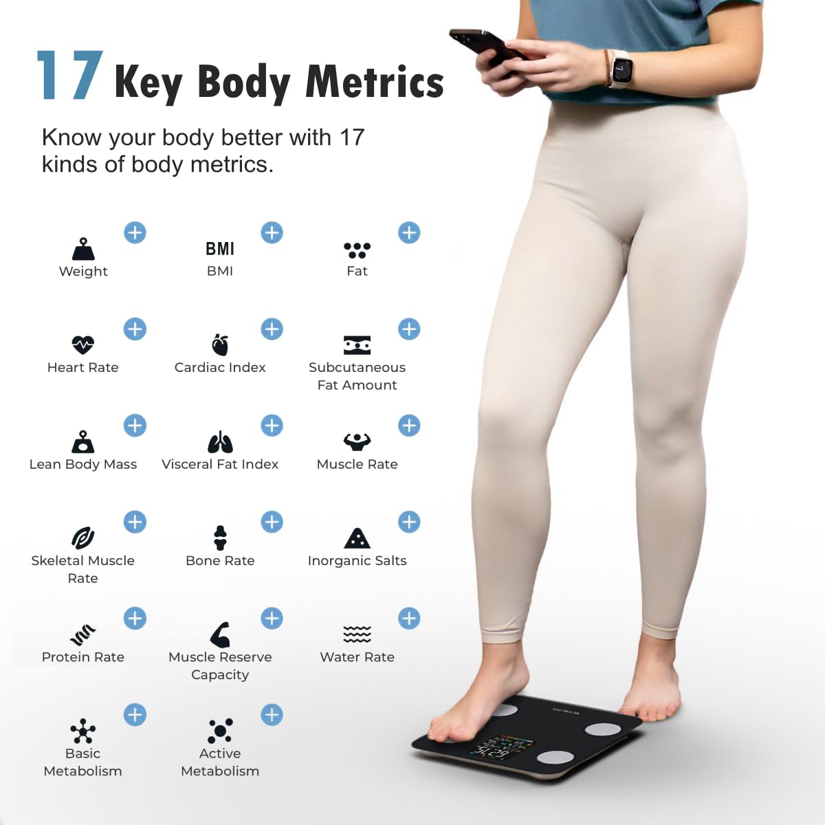 - All in One Display: Our Biometric Scale with an extra large vibrant color display screen enables you to get 7 key body metrics even without your phone. You can completely free your hands to know your basic health condition at a glance.