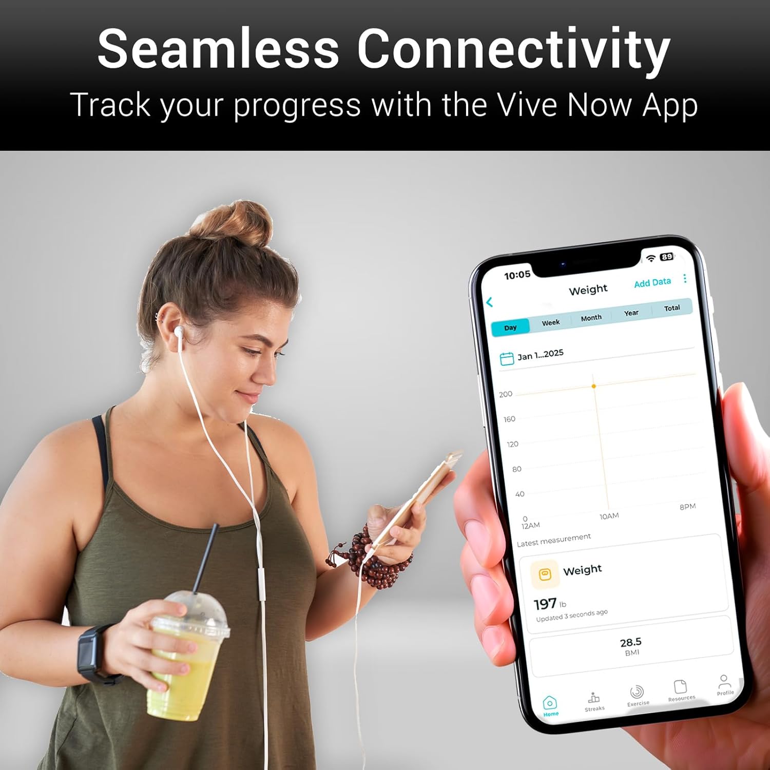 - SEAMLESSLY PAIRS WITH YOUR SMART DEVICE: Monitor your health data while on the go with this smart-device-compatible scale. This scale can be seamlessly paired with your smartphone, allowing you to keep track of your health data using the Vive Now app. With exercise videos and guides and ample data storage, you can keep your wellness tracking at your fingertips.