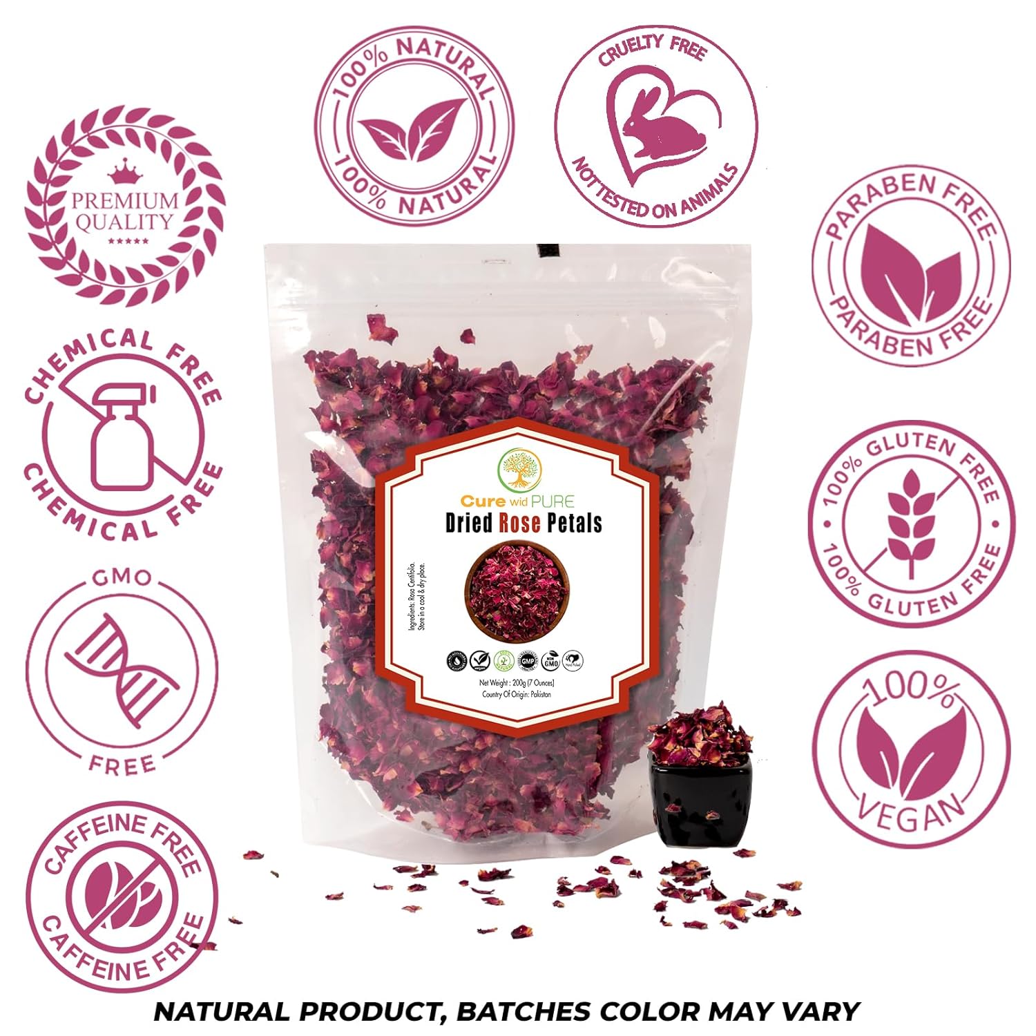 Cure Wid Pure Certified Organic Dried Rose Petals 7oz Food-Grade Edible Rose Petals for Tea,Cocktails,Baking,Skincare & DIY - Sun-Dried,Non-GMO,Gluten & Chemical-Free Edible Flowers in Resealable Bag