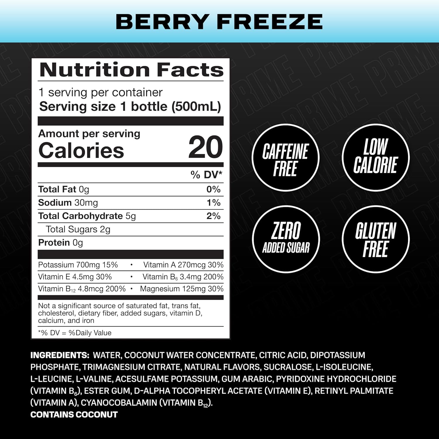 - PACKED WITH ELECTROLYTES: Formulated with 10% coconut water, 250mg BCAAs, B Vitamins, and Antioxidants, Prime helps replenish fluids and key electrolytes—like potassium and magnesium—lost through sweat during workouts, sports, or everyday activity. It's ultimate recovery in every sip.