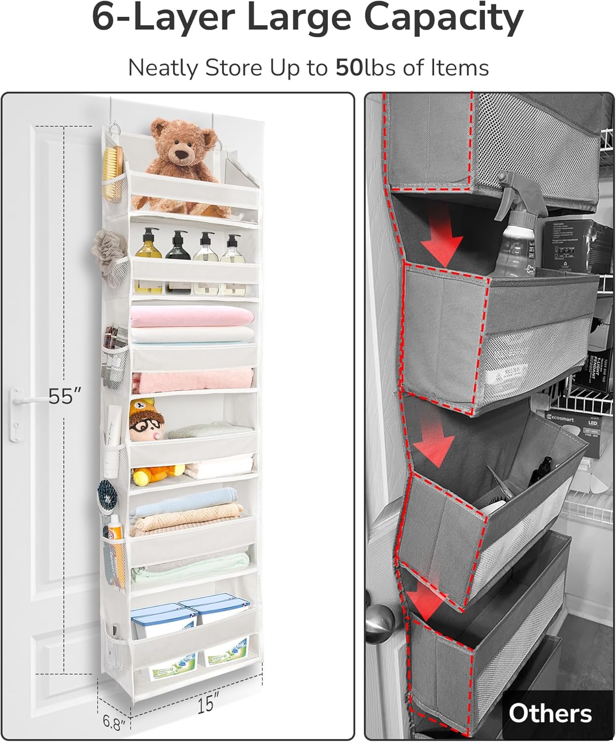 - Maximized Storage, Minimal Effort: Elevate your organization game with our over-the-door organizer. Crafted from long-lasting, breathable non-woven fabric, it boasts 6 spacious pockets and 12 side pockets. Easily access items of various sizes with a whopping 50lbs capacity, creating extra space effortlessly.