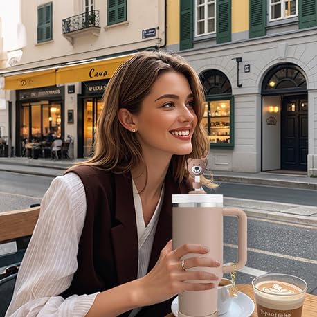 Stanley Cup Accessories Set,Including 2 Pcs 0.4in Straw Cover, 1 Silicone Spill-Proof Stopper Set of 3, 1 Cute Bear Handle Charm, 1 Silicone Boot Fits Stanley 40&30 Oz Tumbler (Almond Rose)
