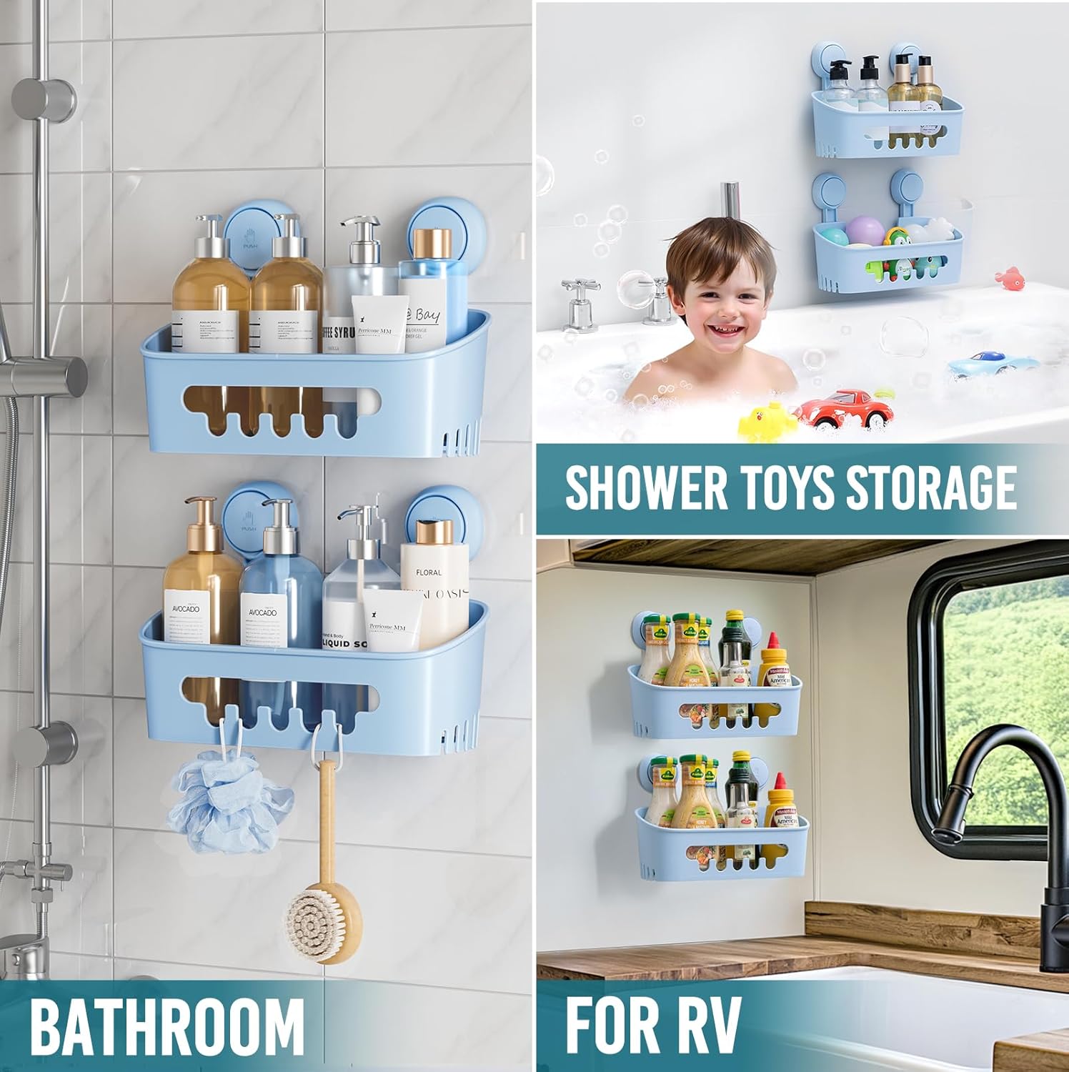 - Fast Draining Design: With drainage holes bottom design, maximizes the air ventilation and water dripping away. Keep your bath products clean and dry quickly. The shower shelves are removable and reusable. You can take them off for cleaning. Suitable for bathroom, washrooms, kitchens, college dorm rooms, even for desk organizer. Suction cup shower caddies are great for renters, travelers, and those who want a temporary shower storage solution