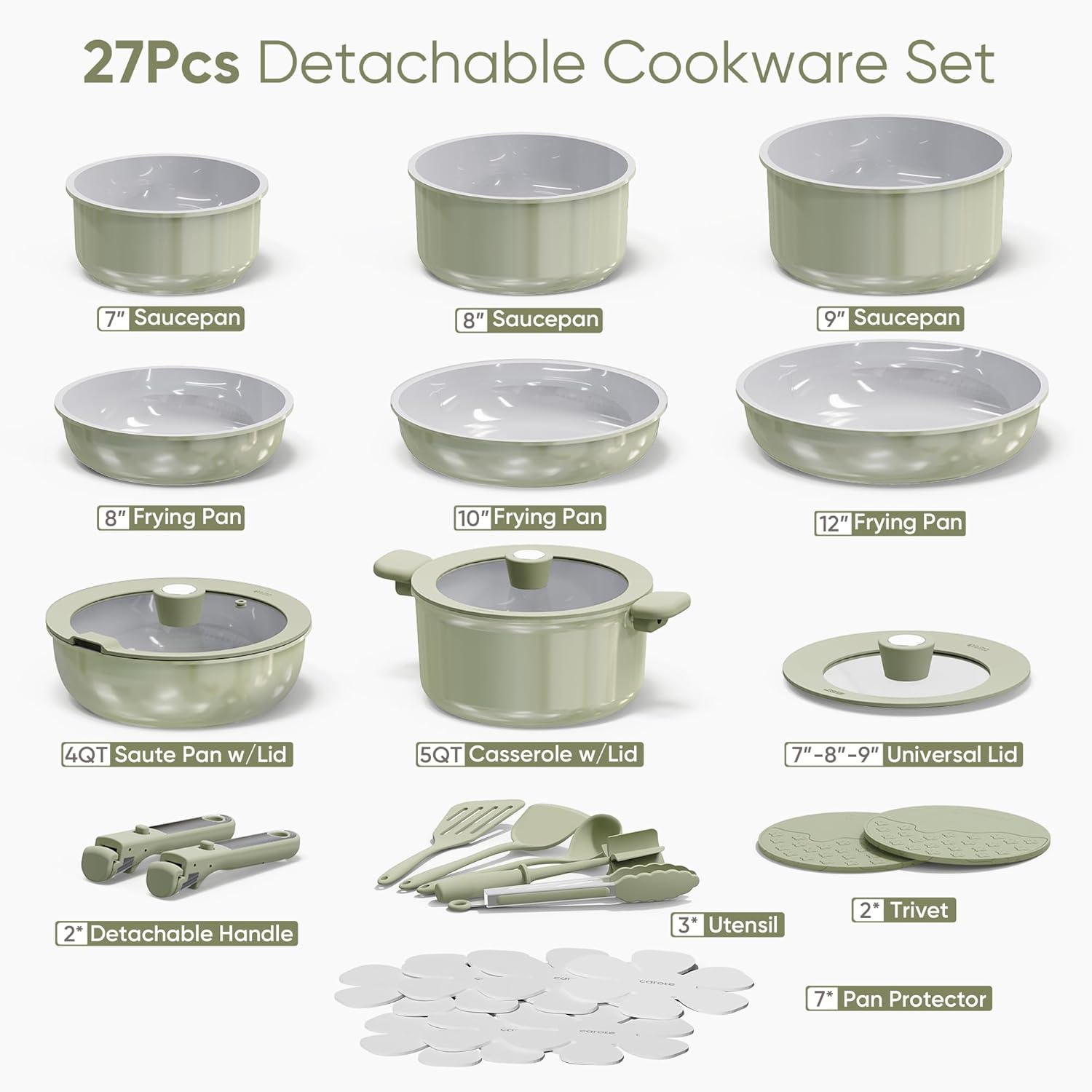 - Set Includes: 8'' fry pan, 10'' fry pan, 12'' fry pan, 1.5-qt saucepan, 3-qt saucepan, 4-qt saucepan, 4-qt sauté pan with lid, 4.5-qt stockpot with lid, 7''-8''-8.5'' universal lid, 2*trivets, 2*detachable handles, fish turner, solid turner, ladle, tongs, potato masher, 7*pan protectors.
