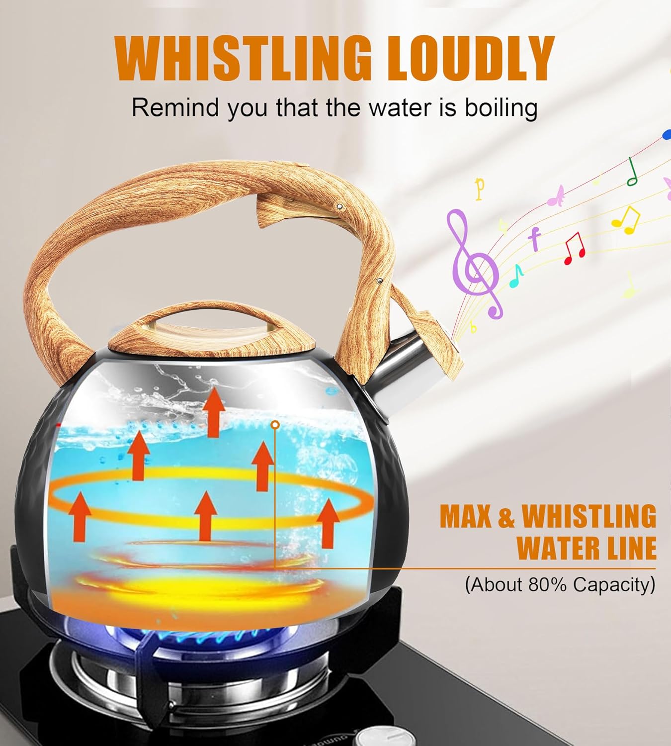 - 【Loud Whistling Sound】Whistling tea kettle has a loud whistle. Even in a noisy environment, the loud whistle can easily remind you that the hot water is ready. You can enjoy other happy times while boiling the water, such as watching movies and listening to music.The water level in the kettle should be lower than the outlet to ensure that the whistle can work properly.