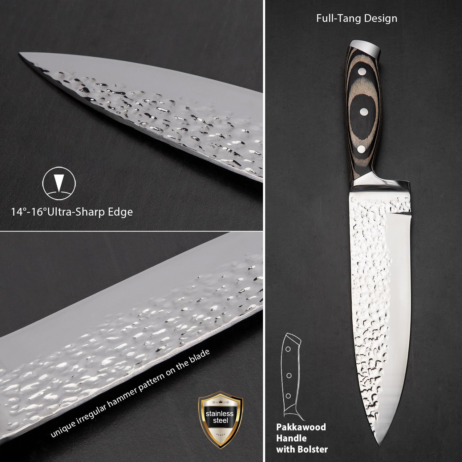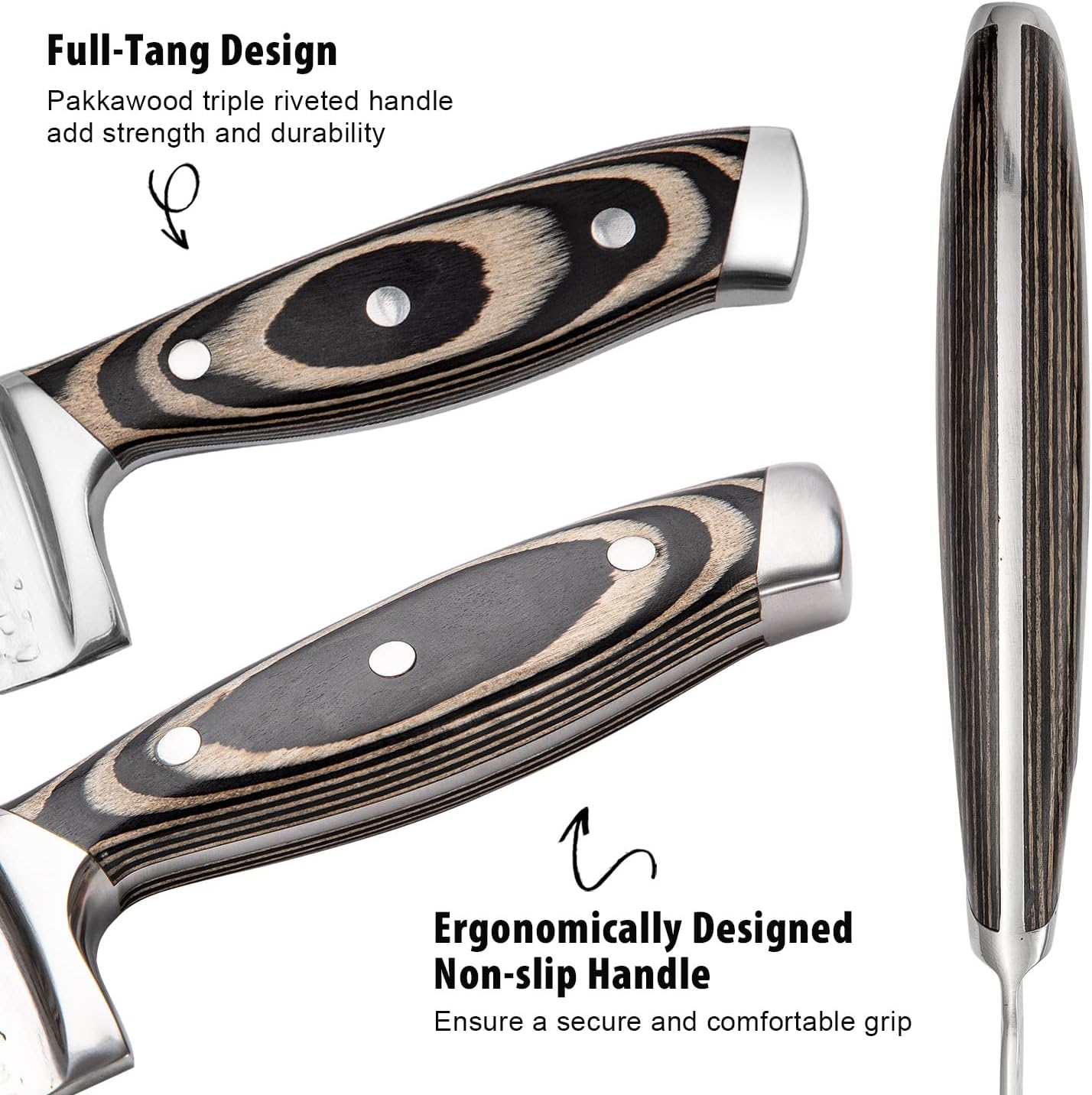 - 【High Quality Kitchen Knife Set】All knives’ blade is forged from Superior high-Carbon stainless steel with excellent corrosion resistance and oxidation resistance.The unique irregular hammer pattern on the blade can effectively prevent food from sticking.A balanced weight distribution and ergonomic handles that it minimize fatigue and maximize the cutting precision for people.