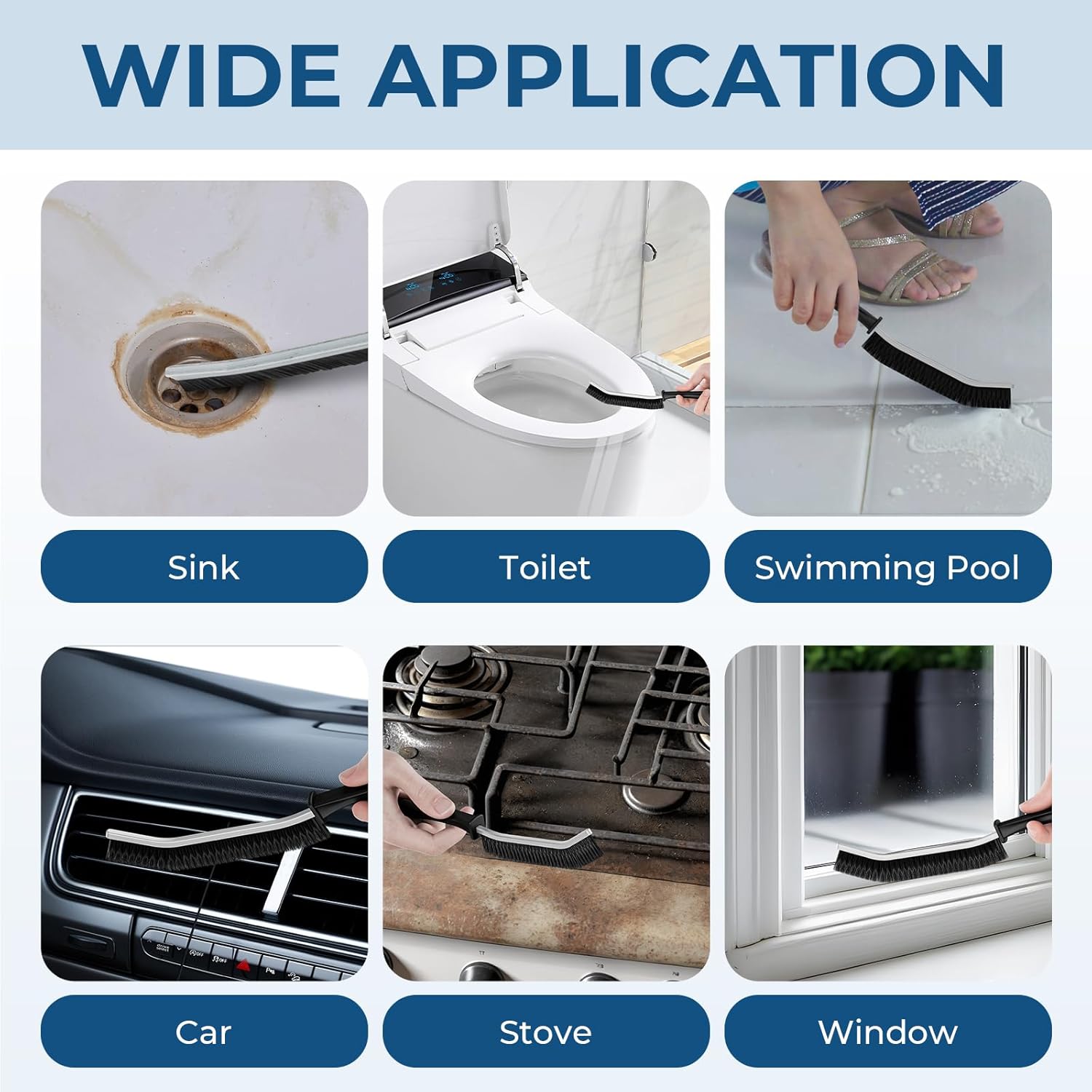 - Multi-purpose Brush: Our cleaning brush is suitable for cleaning various surfaces such as sinks, window tracks, blinds, door tracks, faucets, cars, stoves, grout lines, basins, floors, keyboards, bathtubs, vents, drains, swimming pools, vehicles, furniture, boats, countertops, microwaves, coffee machines, shower door frames, fans, shoes, sneakers, ovens, washing machines, toilet tank floors, the seam between the toilet bottom and toilet lid, the gaps in carved furniture, outdoor brick seams, etc.