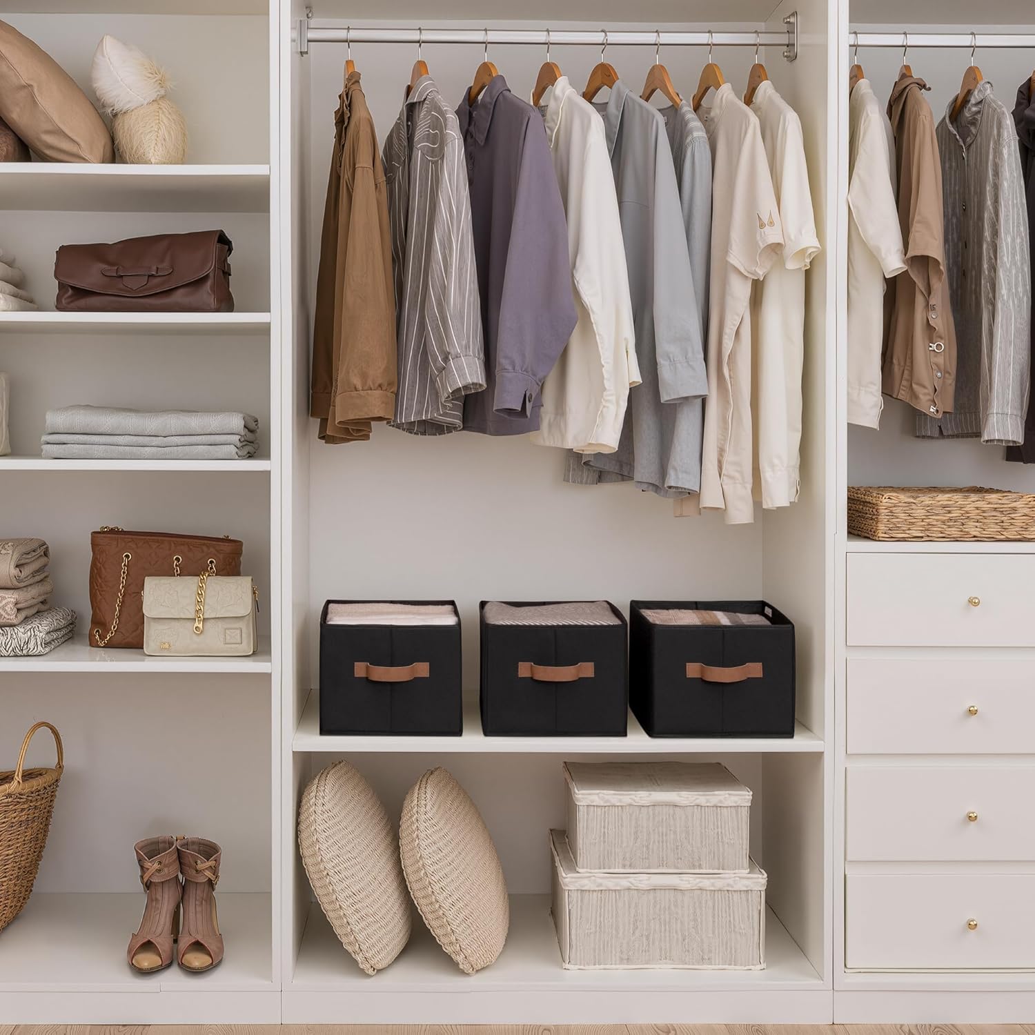 SroageWorks Storage Baskets for Shelves, Foldable Fabric Closet Storage Bins with Handles, Clothes Organizer Laundry Baskets, Black, 3-Pack, Large