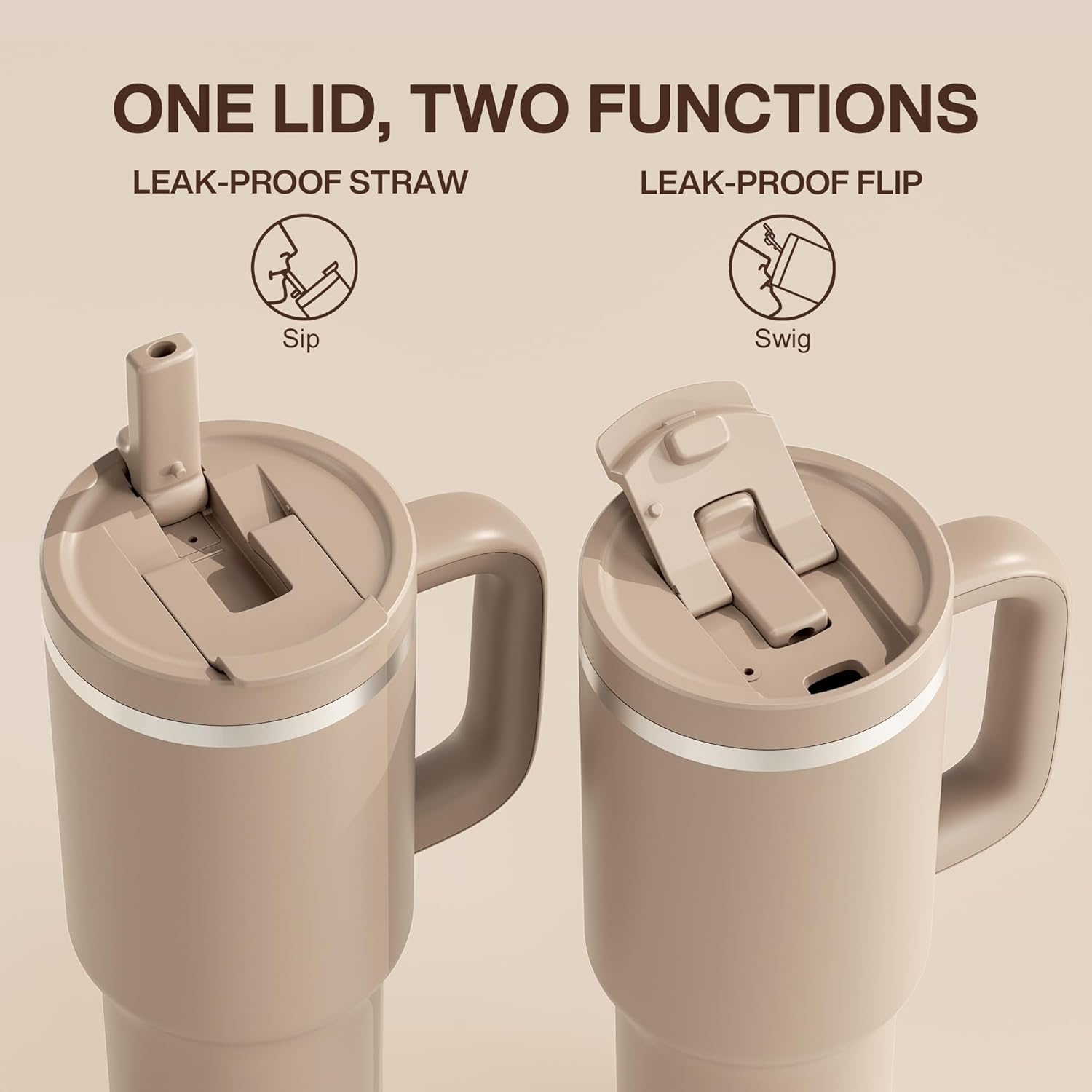 ENCOOL 40 oz Tumbler with Handle and Straw: Stainless Steel Insulated Tumbler Keeps Cold for 24 Hours, Leakproof Travel Cup Fits in Cup Holder and BPA-Free,Raw Umber