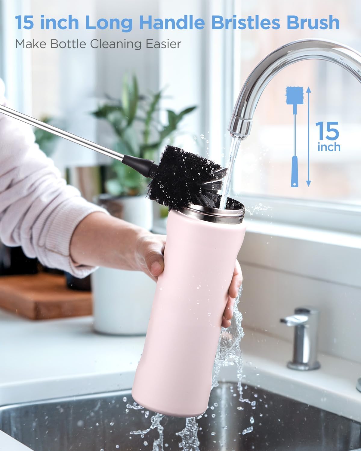 • 【15" Long Stainless Steel Scrubber】:This 15-inch long-handled bottle brush conquers tall water bottles [such us Stanley Cup/hydroflask/Owala Water Bottles], carafes, and deep Ice Tea jars. Featuring soft black bristles that safely clean delicate glassware without scratches, paired with sturdy grey tip bristles to powerfully scrub bottle bottoms and tight corners.