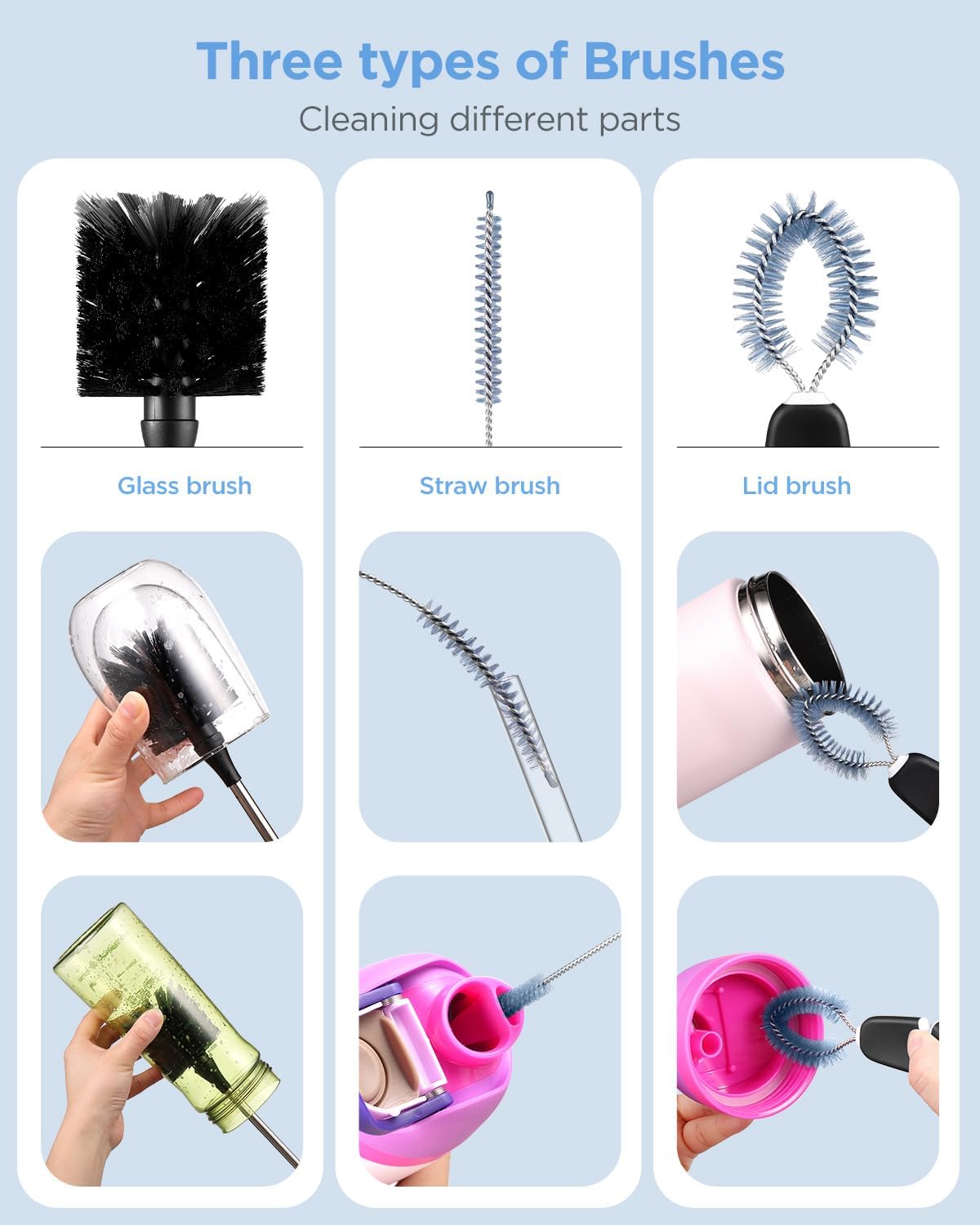 • 【With Extra 2 PCS Compact Straw Cleaner Brush & Nipple Brush 】:This bottle brush cleaner is not just for Owala Stanley Yeti Hydroflask Tumblers water bottles Cap, but also great for wine decanters/Baby Bottles/sink drains/Juicer blades. 3 pcs bottle brush to clean them all, ideal for homes, cafes, and restaurants.