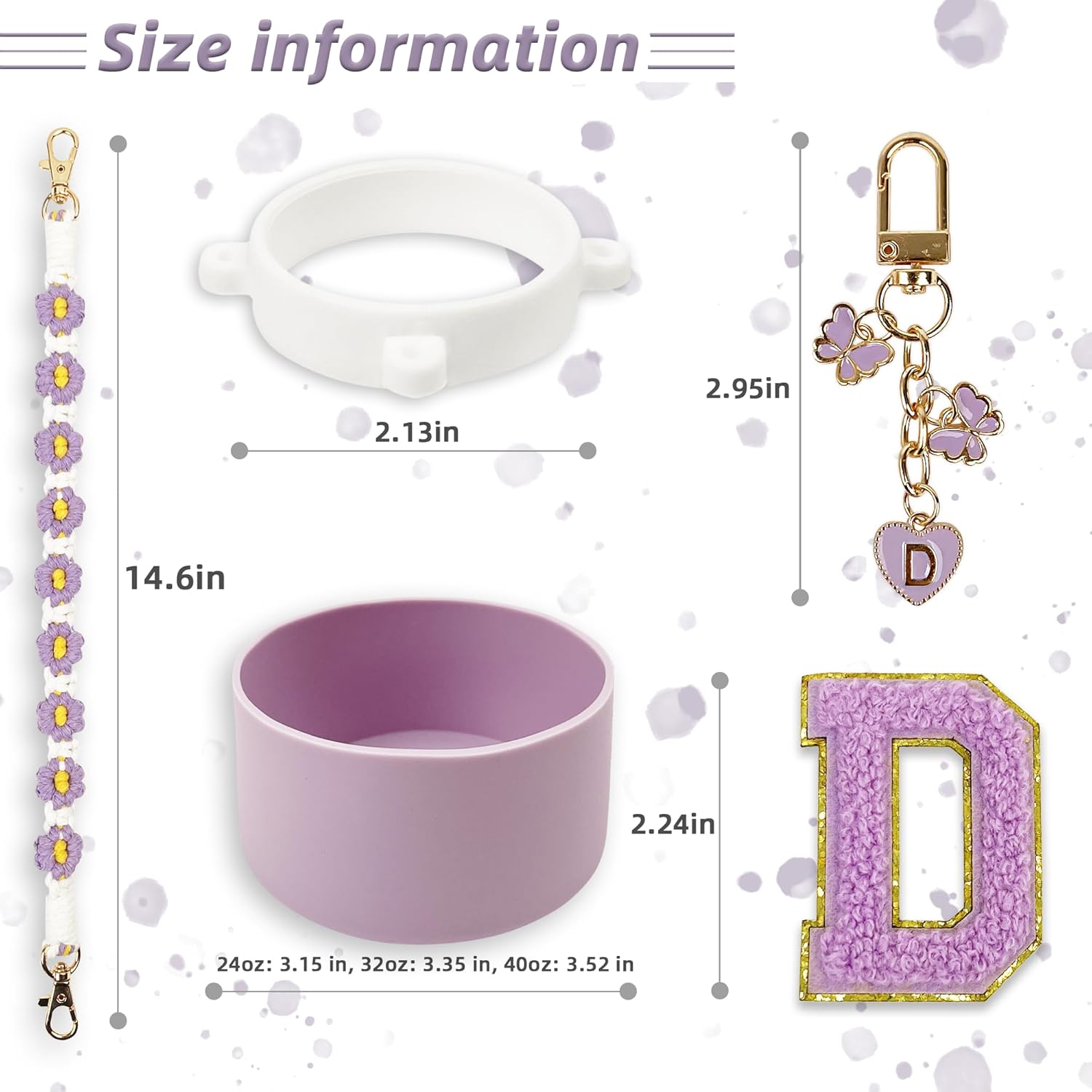 • Compatibility: This set includes a perfectly fitting silicone boot for Owala FreeSip 24 oz and Owala Tumbler 24 oz, along with a handle strap, letter stickers, and a letter keychain