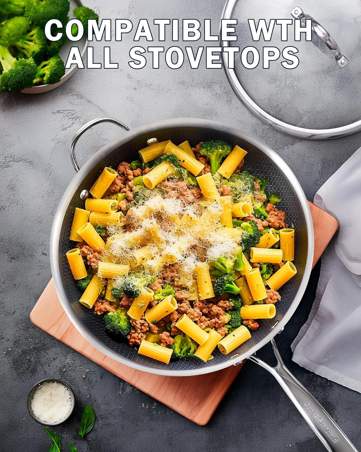 - Laser-Etched Hybrid Nonstick: The surface of the stainless steel wok features precision laser-etched textures, combined with a health-conscious nonstick coating, providing enhanced durability, scratch resistance, and long-lasting nonstick performance
