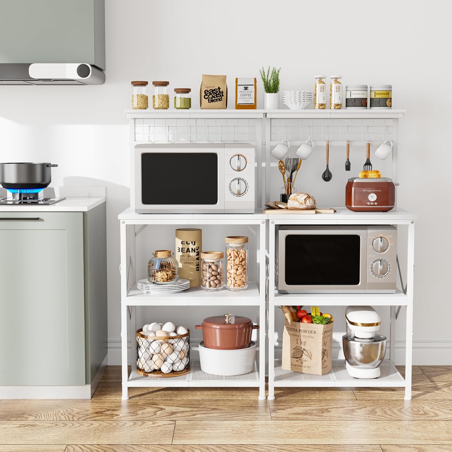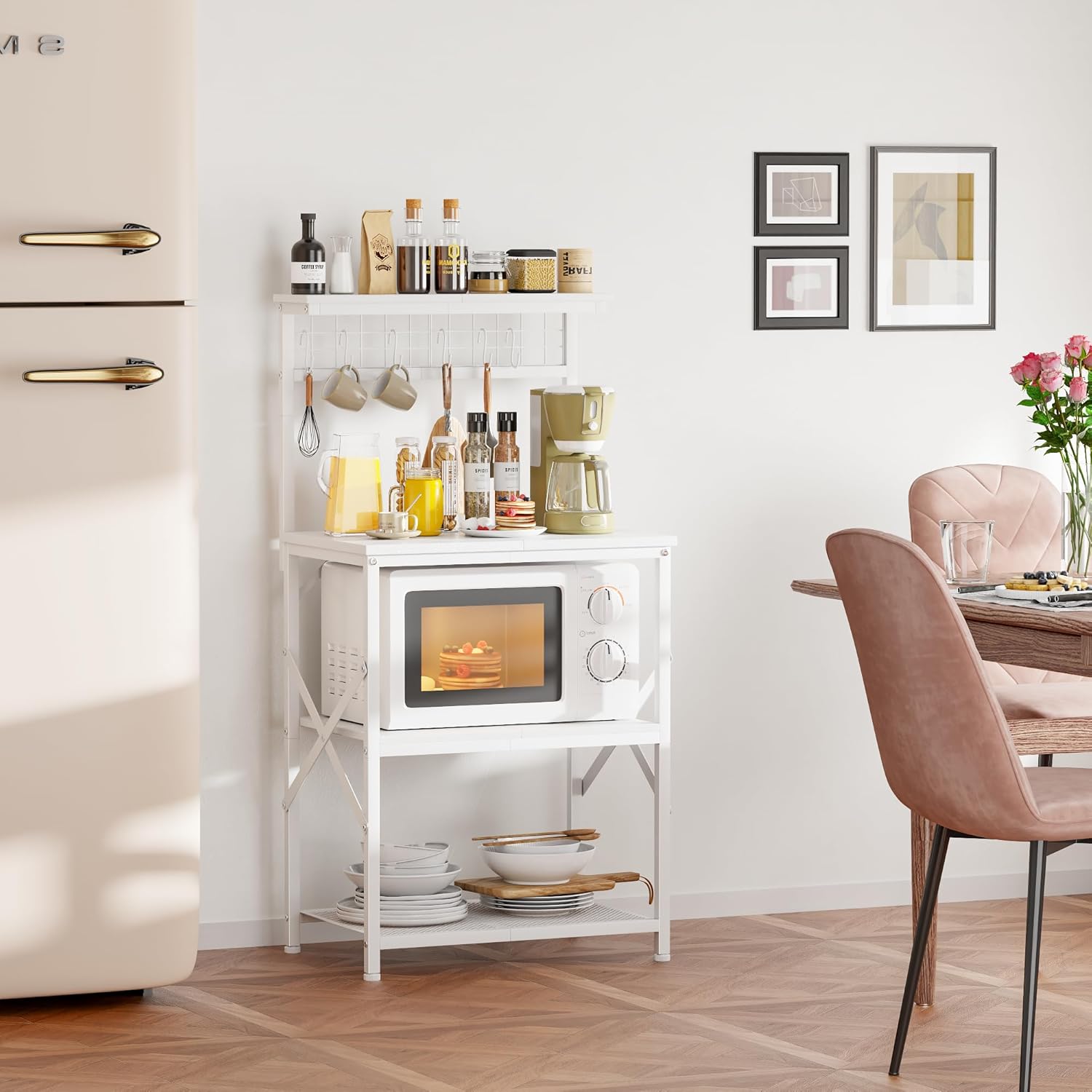 Furologee Kitchen Bakers Rack with Hutch, Coffee Bar Station 4 Tiers, Microwave Oven Stand with 6 S Hooks and Pegboard, Kitchen Microwave Rack for Spice Organizer Workstation, White
