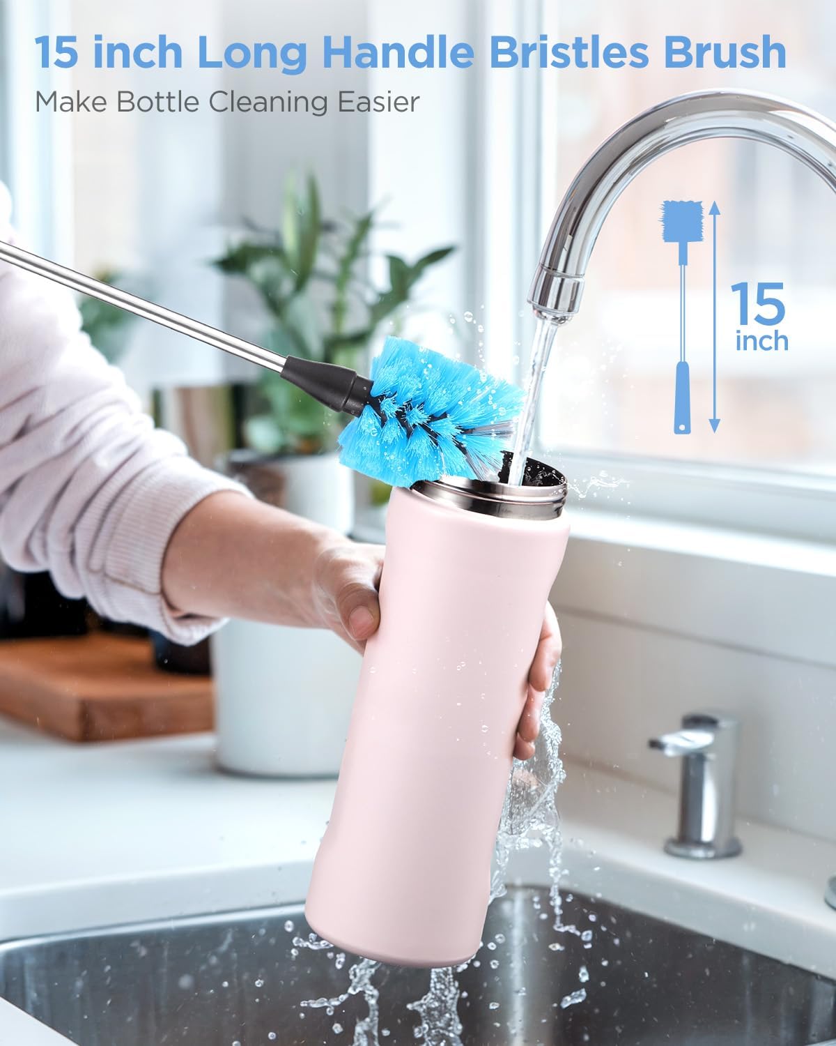 • 【15" Long Stainless Steel Scrubber】:This 15-inch long-handled bottle brush conquers tall water bottles [such us Stanley Cup/hydroflask/Owala Water Bottles], carafes, and deep Ice Tea jars. Featuring soft black bristles that safely clean delicate glassware without scratches, paired with sturdy grey tip bristles to powerfully scrub bottle bottoms and tight corners.