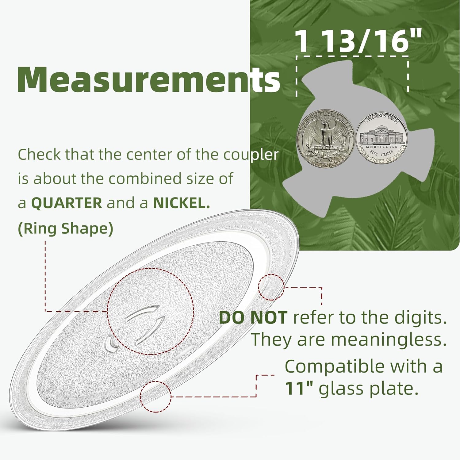 - 【Measurement 1】This 11 in microwave glass turntable plate has a one-quarter and one-Nickel sized ring shape hole in the center. The center spot of microwave glass turntable coupler measures 1 13/16" in diameter