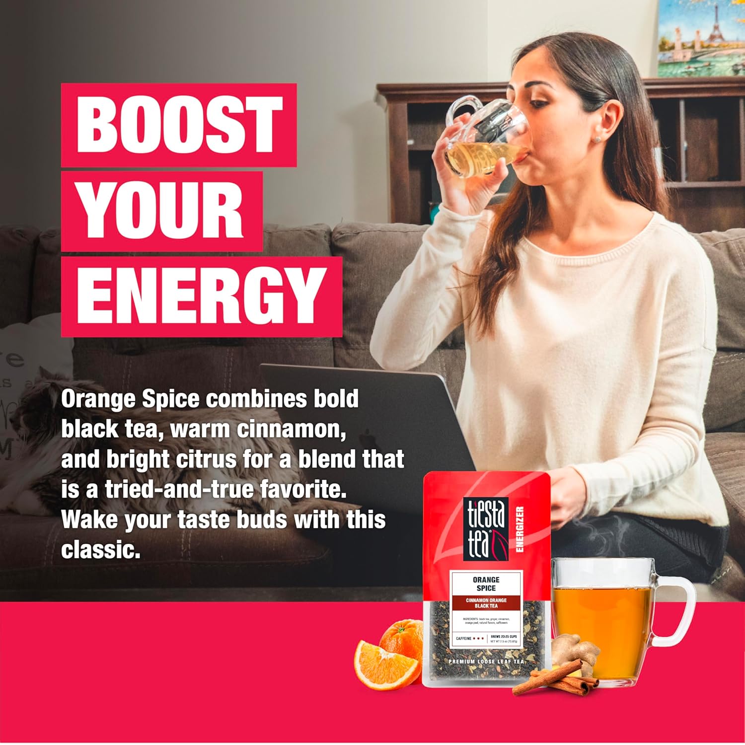 - HIGH CAFFEINE FOR AN EXTRA BOOST: Packed with high caffeine from bold black tea, Orange Spice offers a powerful pick-me-up whenever you need it. Whether you need to power through your morning or recharge in the afternoon, this energizing tea is your perfect companion for staying alert and focused throughout the day.