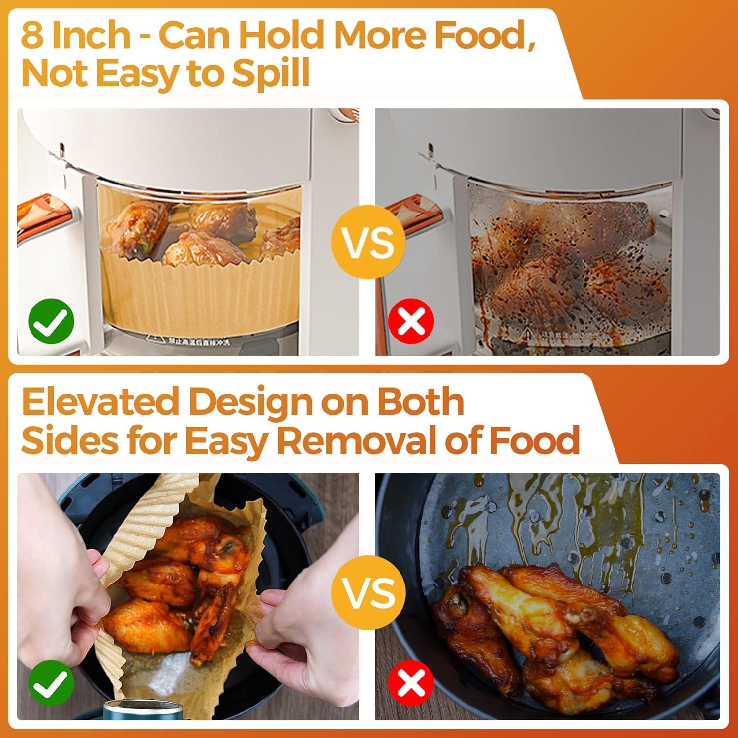 - Healthy & Reliable Materials: Vailnd air fryer parchment liners are crafted from unbleached raw wood pulp with a food-grade silicone oil coating. Free of fluorescent agents, BPA, and PFAs, they ensure safe, non-toxic baking without food mess