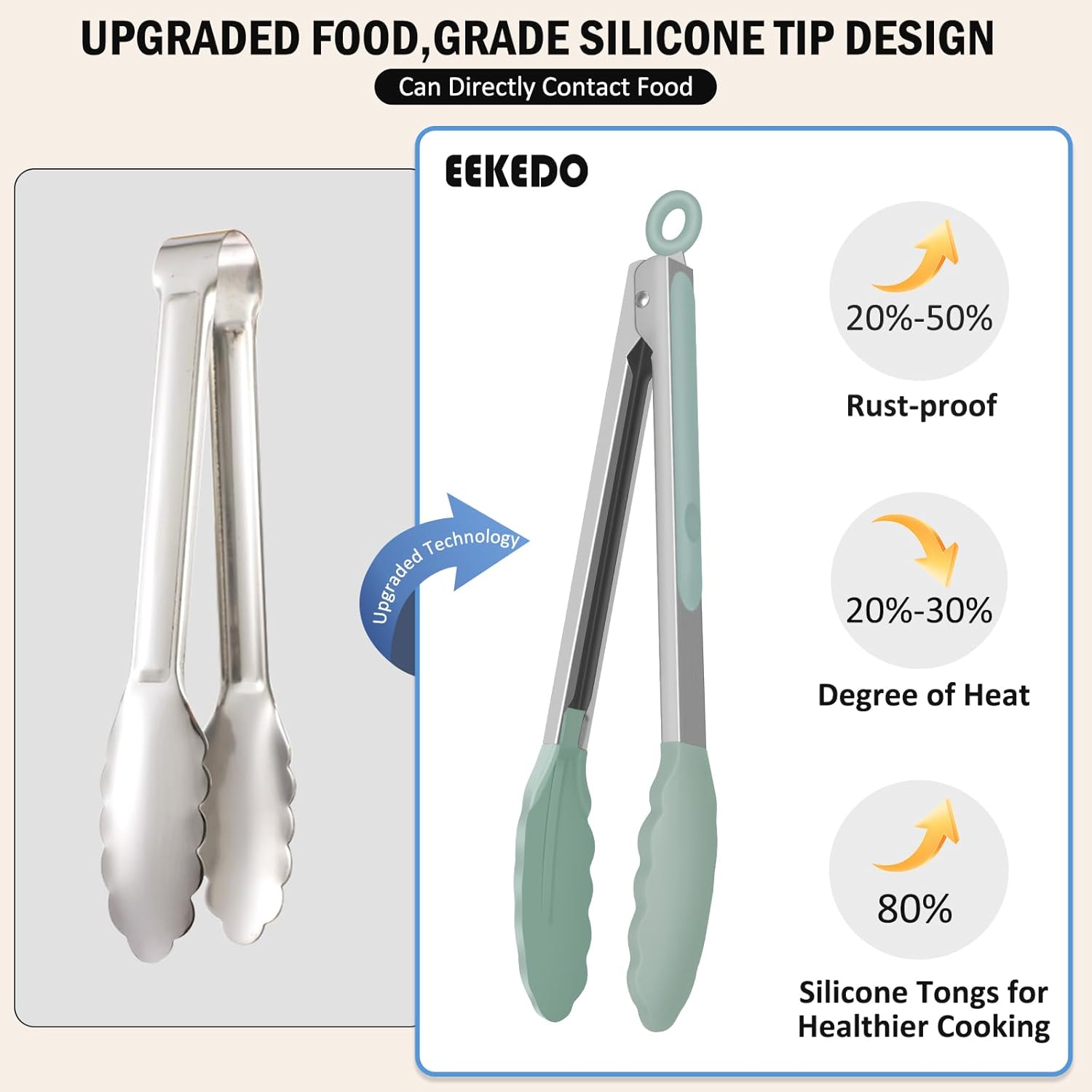 • 600ºF High Heat-Resistant: The silicone tongs feature BPA free silicone tip that will not scratch your nonstick cookware. Scalloped edges securely hold food. EEKEDO Tongs are great for frying, grilling, stirring, and serving. Non-stick surface easy to rinse, dishwasher safe.