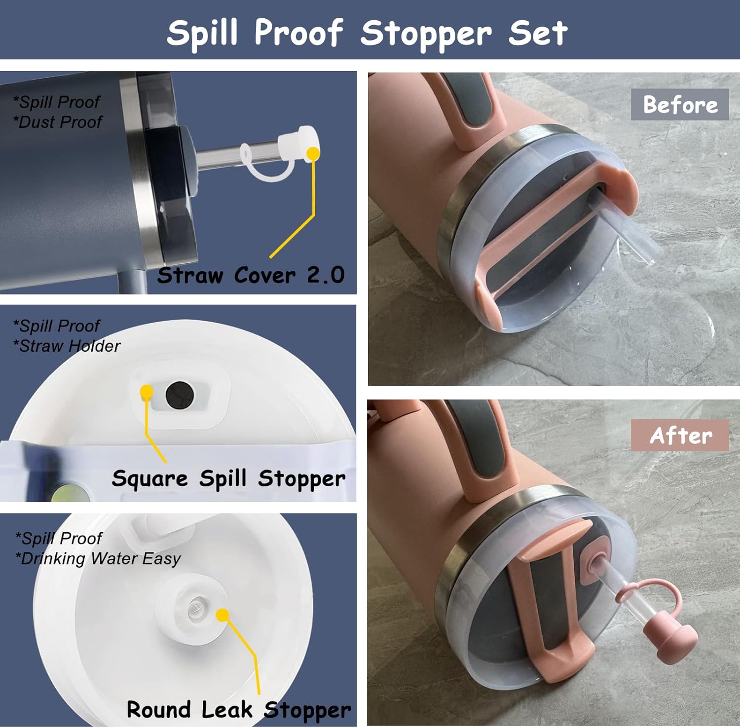 - Complete Package: Vikgle Stanley Cup Accessories Set, include 2pcs 0.4 Inch/10 mm Straw Cover Cap, 1pcs Cute Handle Charm, Spill Proof Stopper Set of 3pcs and 1Pcs Silicone Boot. Suitable for Stanley Quencher 30/40 oz and Stanley IceFlow 20/30 oz tumblers water bottles & others cup bottom diameter 2.75-2.95 inch