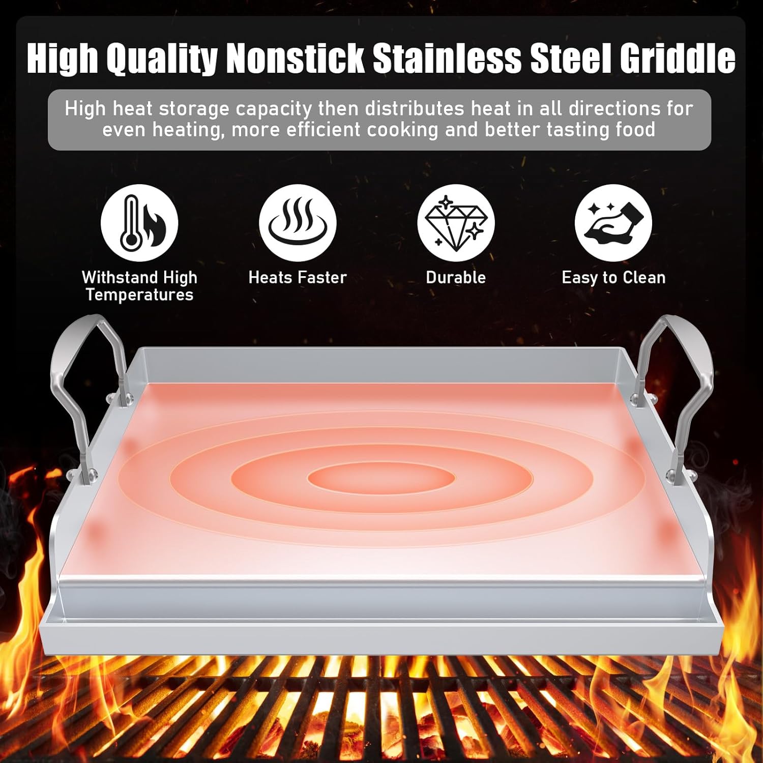 - ( Durable & Safe )Crafted from premium stainless steel, this griddle is built tough and resists warping for long-lasting use. The smooth nonstick griddle surface ensures safe cooking, effortless food release, and easy cleanup. Compared with heavy cast iron, this lightweight griddle is easier to move, making it a practical choice for everyday grilling and outdoor cooking. - Reinforced triangular support ridges at the bottom ensure even heat distribution, eliminate hot spots, promote uniform cooking, and prevent the grill sheet from warping.