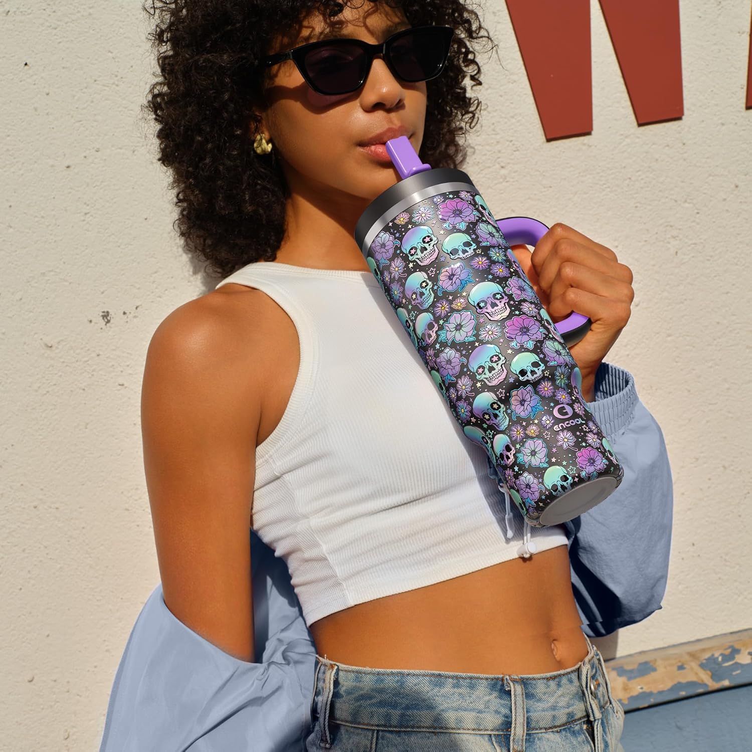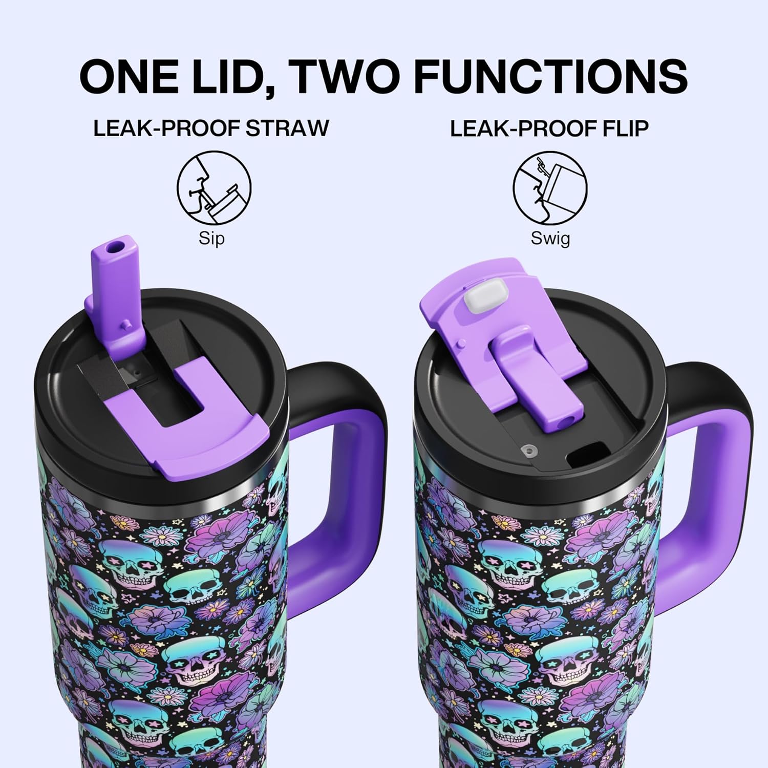 ENCOOL 40oz Halloween Tumbler with Handle and Straw, Stainless Steel Insulated Water Bottle with Straw, Leak-Proof, Cup Holder Friendly, Keeps Cold 24 H, Gifts for Women Men, Floral Afterlife