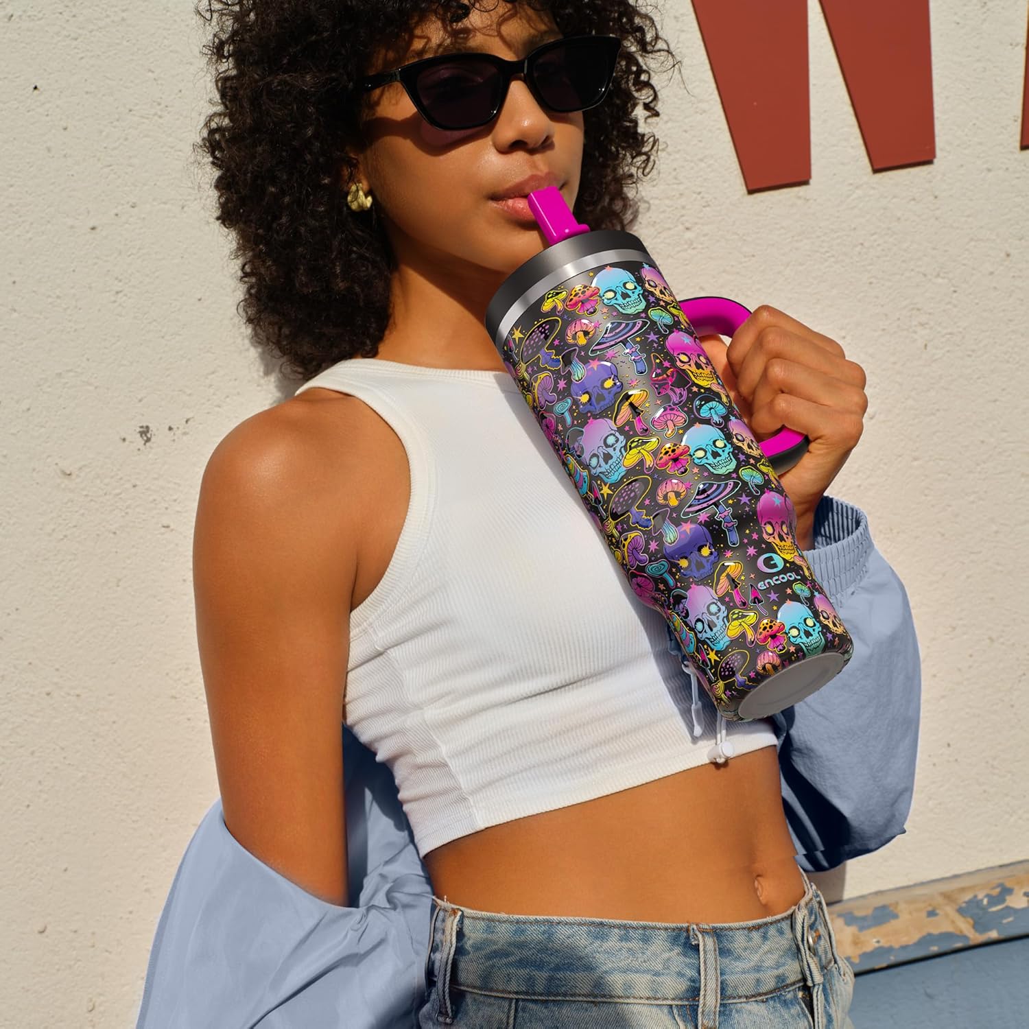 ENCOOL 40 oz Tumbler with Handle and Straw: Stainless Steel Insulated Tumbler Keeps Cold for 24 Hours, Leakproof Travel Cup Fits in Cup Holder and BPA-Free, Trippy Skulls