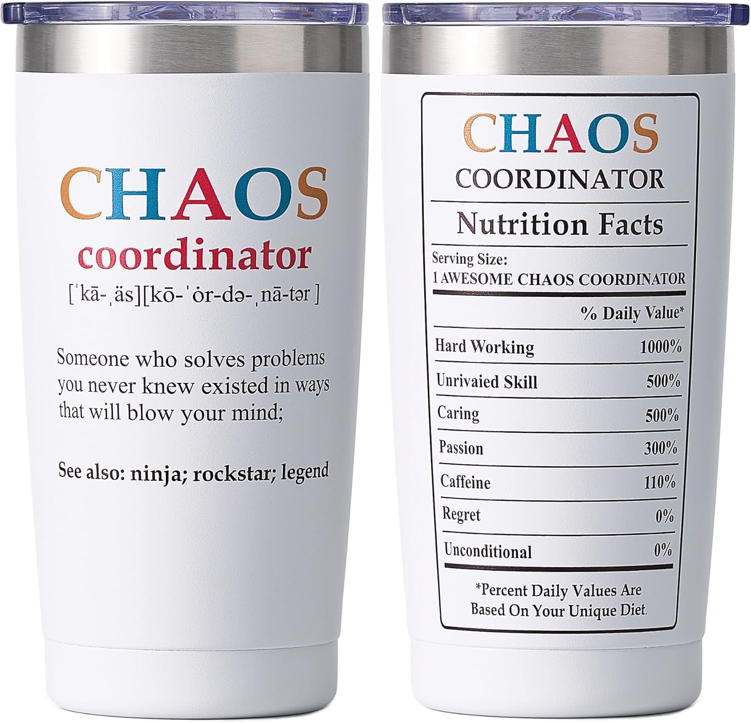 SUNWILL Coffee Tumbler with Lid, Christmas Gifts for Women, Stainless Steel Insulated Mug, CHAOS Coordinator Cups for Birthday, Thank you, Graduation - 20 oz Snow White