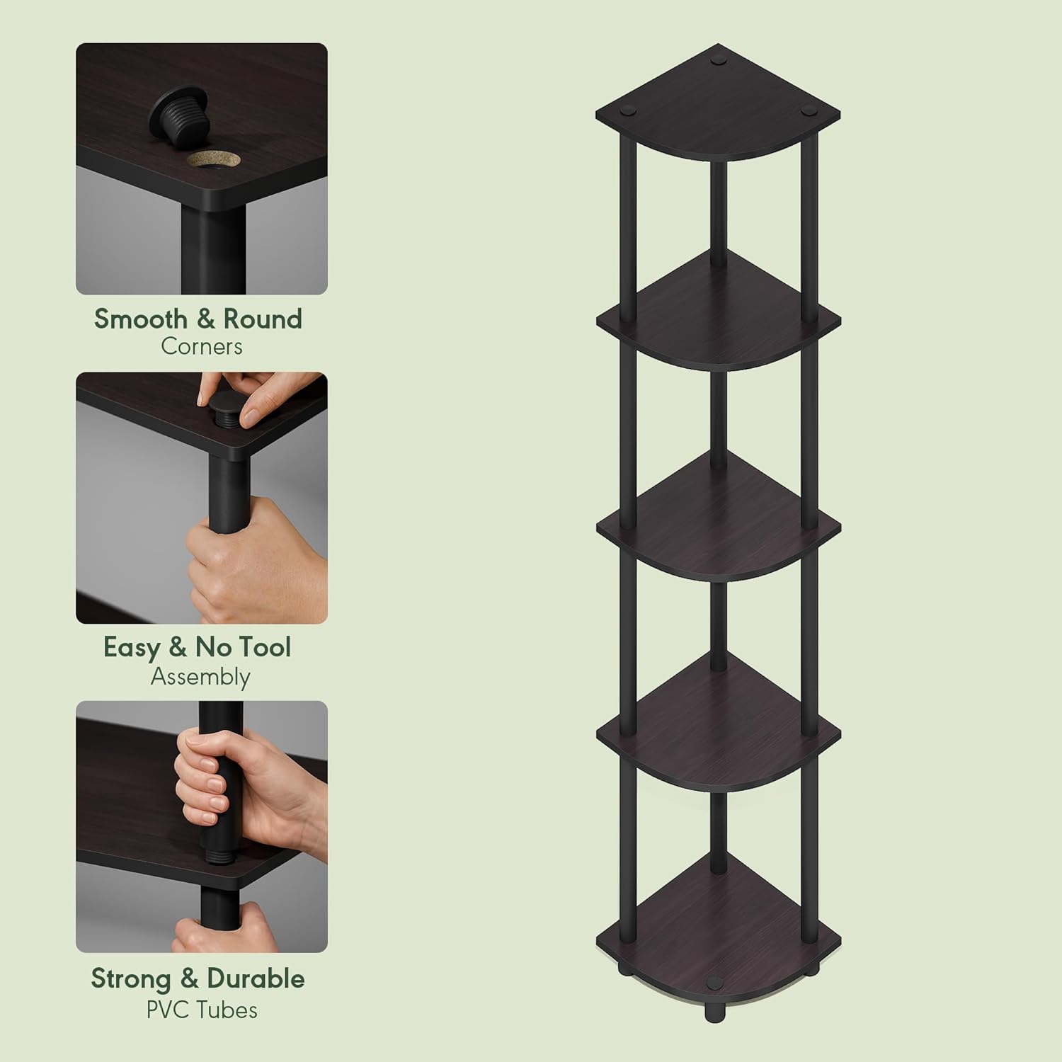 Furinno Turn-N-Tube Corner Shelf, 5-Tier Corner Bookshelf, Open Storage Shelves, for Organization and Storage, Living Room, Home Office, Garage, Bedroom, Dark Mocha