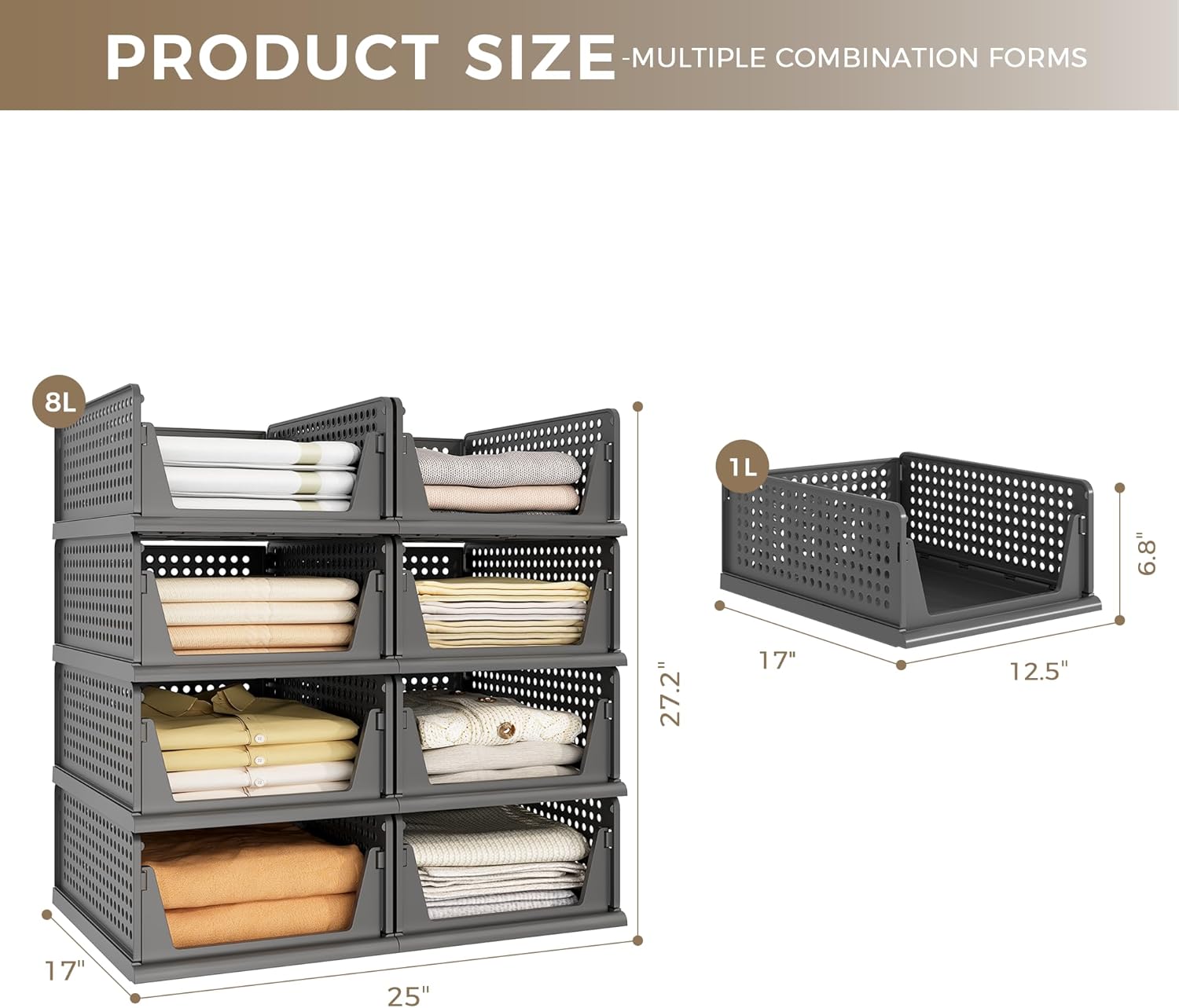 Pinkpum 8 Pack Closet Organizers and Storage Plastic Stackable Storage Bins, Foldable Drawer Shelf Storage Container for Wardrobe Kitchen Bathroom Dorm Black