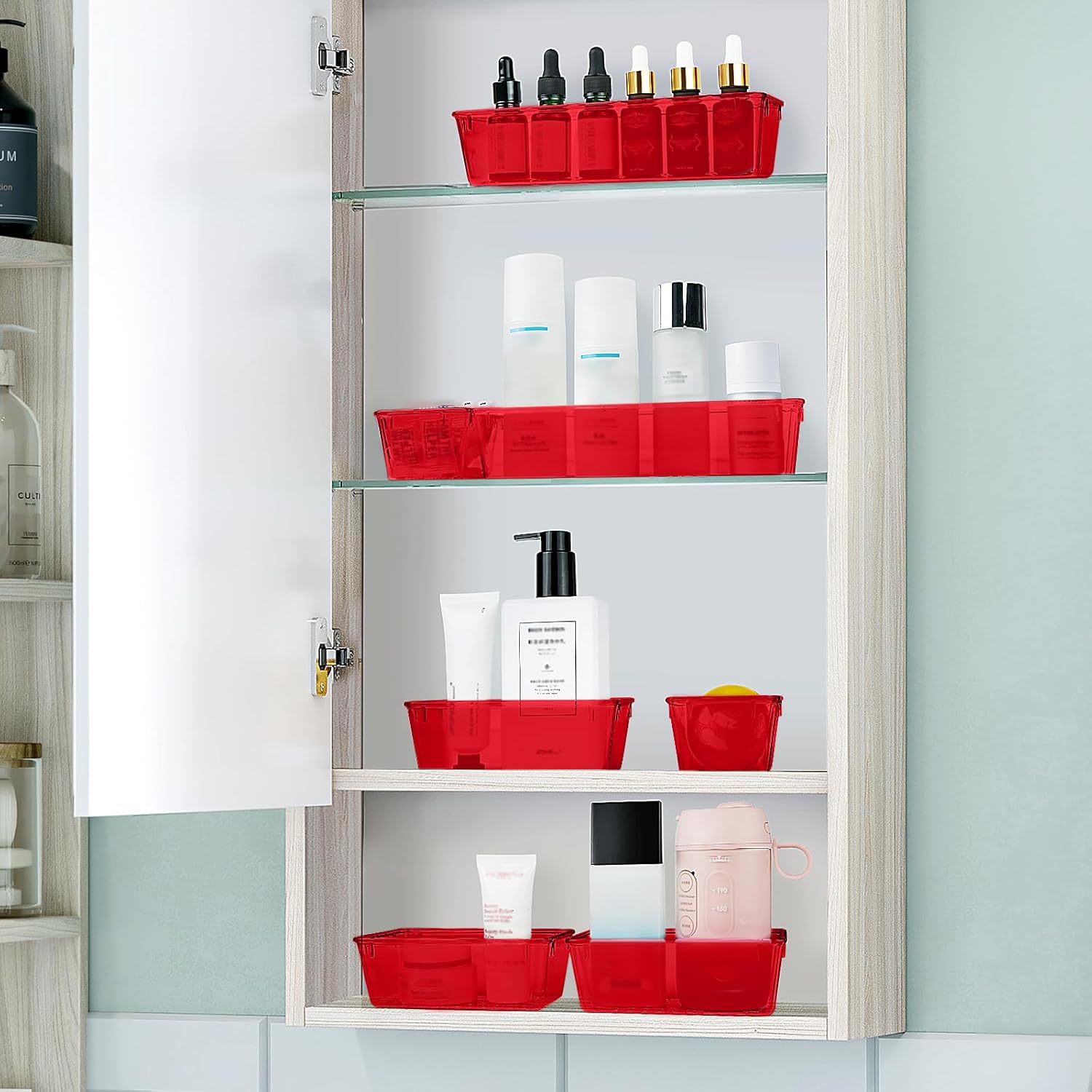 WOWBOX 25 PCS Plastic Drawer Organizer Set, 4 Sizes Desk Drawer Divider Organizers and Storage Bins for Makeup, Jewelry, Gadgets for Kitchen, Bedroom, Bathroom, Office, Clear Red
