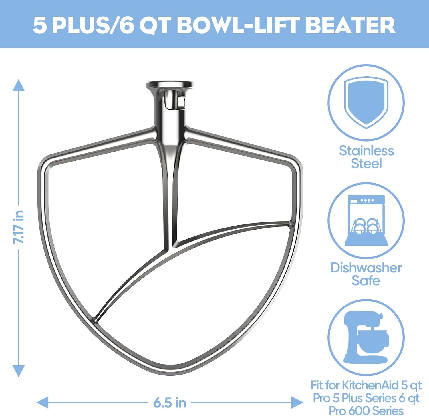 Stainless Steel Flat Beater for KitchenAid 5Plus-6Qt Bowl-Lift Stand Mixer, Paddle Attachment for Kitchenaid Mixer, Heavy Duty and Dishwasher Safe