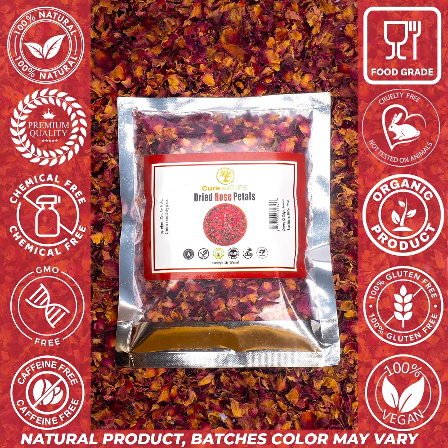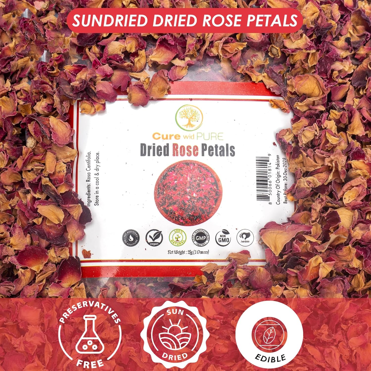 Cure Wid Pure Certified Organic Dried Rose Petals 1oz Food-Grade Edible Rose Petals for Tea,Cocktails,Baking,Skincare & DIY - Sun-Dried,Non-GMO,Gluten & Chemical-Free Edible Flowers in Resealable Bag